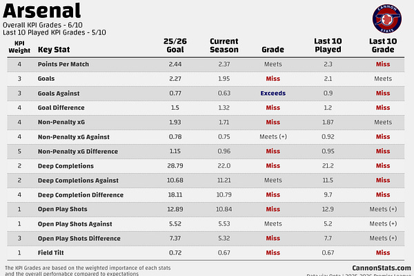 Checking in on how Arsenal are performing compared to the Key Performance Indicators for the 2025-26 season