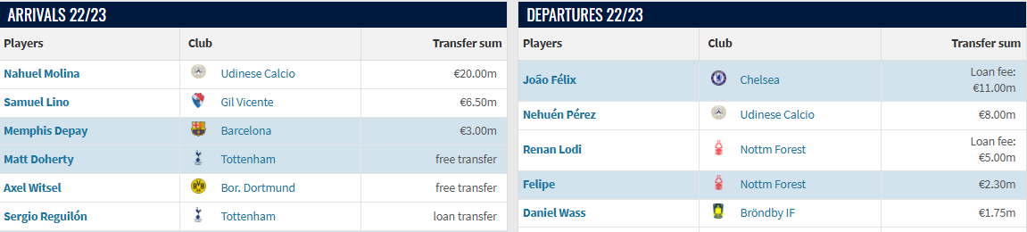 In winter, Atleti would bring in Memphis on a cheap deal as well as Matt Doherty. Depay would be fairly useful when he was actually able to play, while Doherty barely played before leaving for free that summer. The most interesting action is on the outgoing side, where Félix (on high wages) was shipped to Chelsea for an €11m fee. Given his very public falling out with the club, that was a dream scenario for Madrid. Atleti also found a taker for Cunha, who hadn’t caught on in Madrid, when Wolves took him on a loan-plus-obligation (stay tuned).