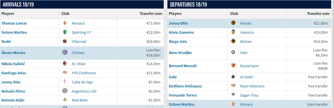 On the outgoing side, Atleti did well to get a few million for Vrsaljko, who would prove ineffective at Inter on loan. Gameiro had a few more useful seasons left at this point but the fee here was decent. Of course, the real regret is likely Diogo Jota, who sold for three times the price just two seasons later. But Atleti did double its initial investment, at least.