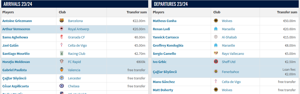In the summer, Atleti completed its excellent moves to sell Cunha to Wolves for €50m and Lodi for €20.6m, making about €71m on players they’d bought for €55m and largely not enjoyed having.