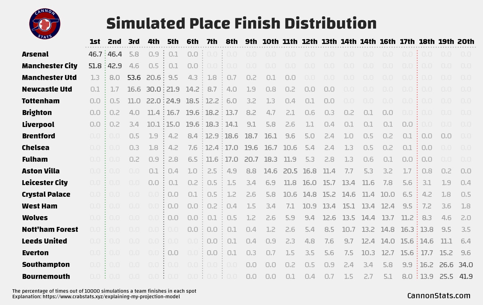 After this weekend’s matches, my model is still very skeptical of them as in the title race. The betting odds are slightly more optimistic putting them in the 6% range but it is still very much a long shot at this time.