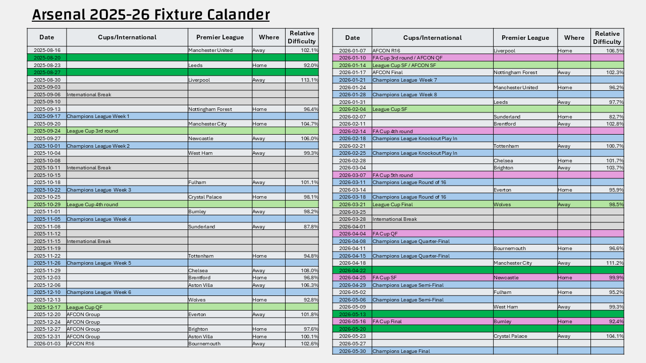 Arsenal have a full schedule and play every team home and away, lets see how the sequencing looks