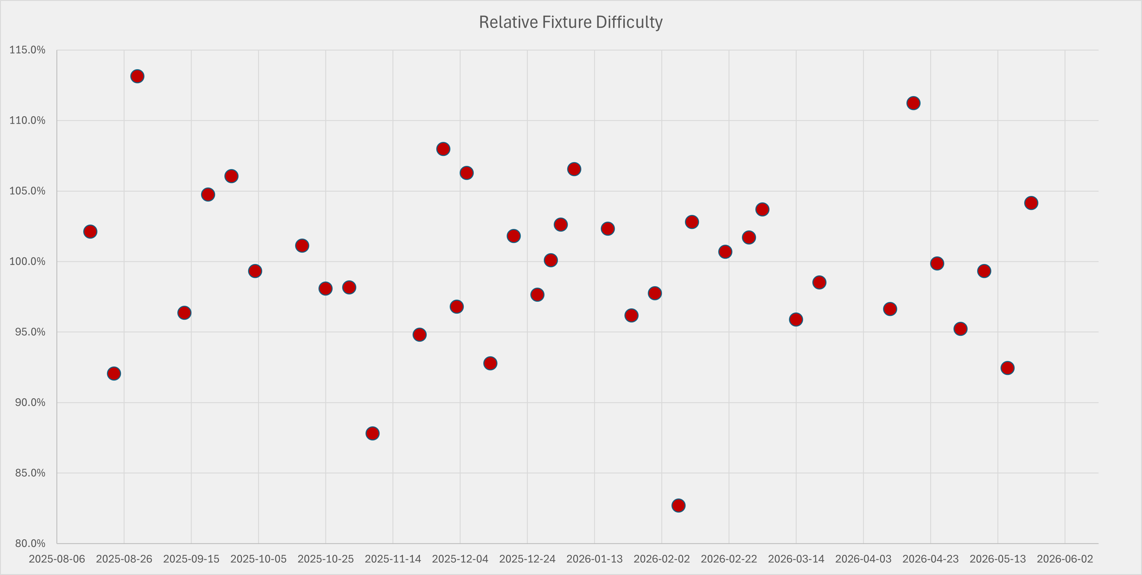 On paper there is just one above average difficulty match and that is the final one against Crystal Palace who hopefully will be safely in midtable again and on the beach for that.