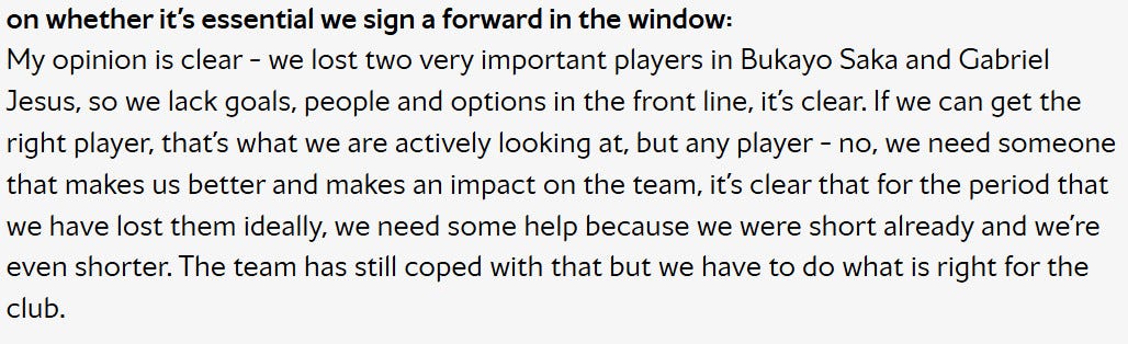 A big worry in the social media space today has been that Arsenal simply are asking too much of the five players they have who can play an attacking position - Martinelli, Havertz, Trossard, Sterling, Nwaneri. If one picks up any sort of significant injury, therefore, it all falls apart. And that’s without factoring in whether Bukayo Saka is actually coming back.