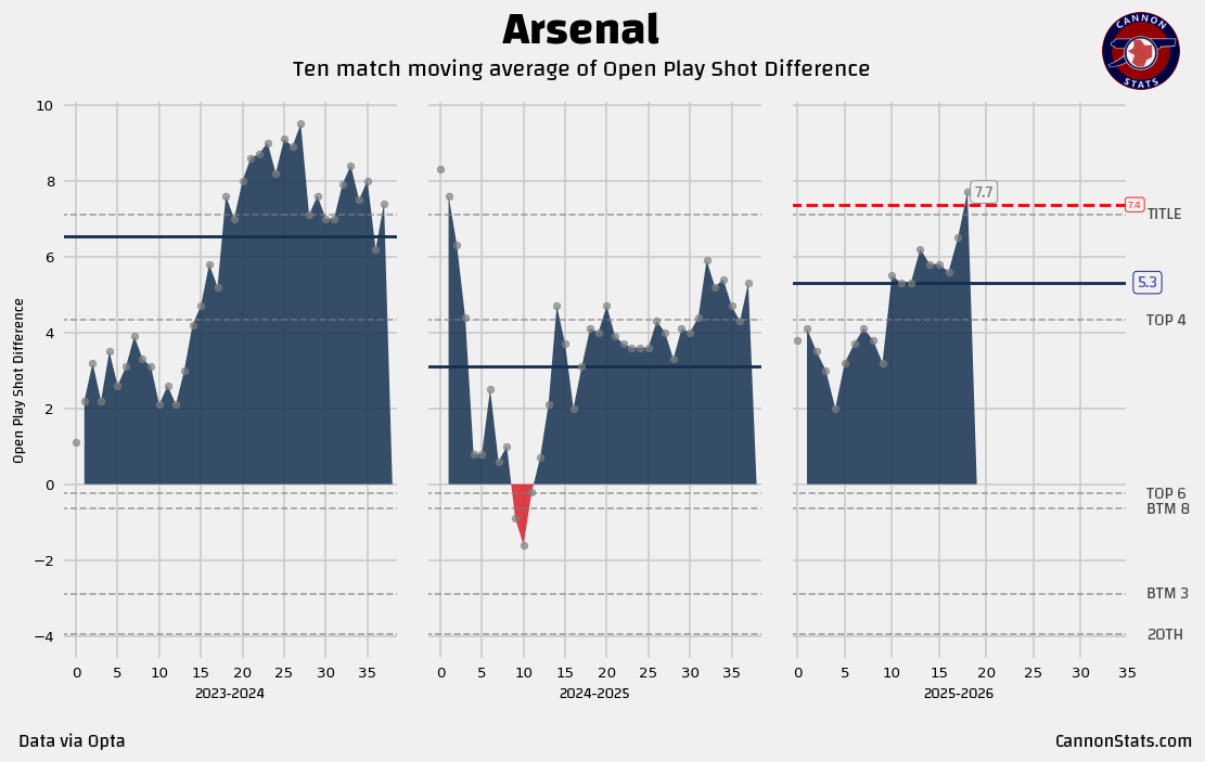 I have seen Arsenal generate excellent shot quality and volume under Areta so I knew it could happen, but we needed to wait until the attack got healthier. Now that the attack is starting to get back to full fitness the numbers have bounced back and we are seeing some real positives signs.