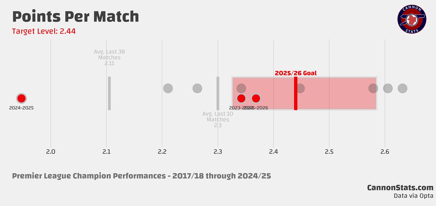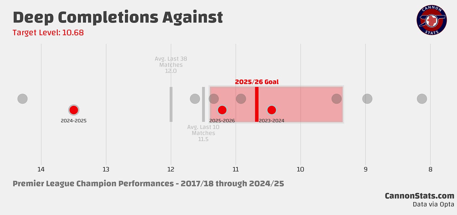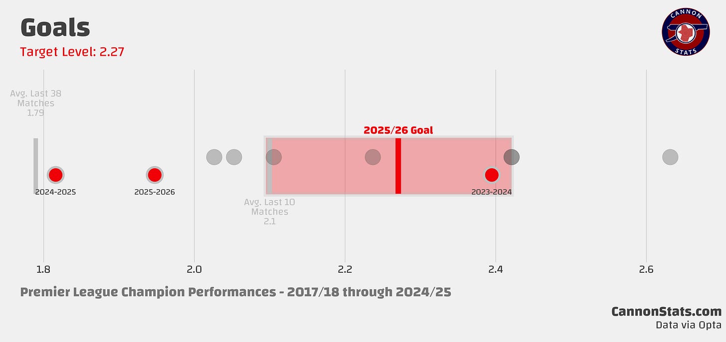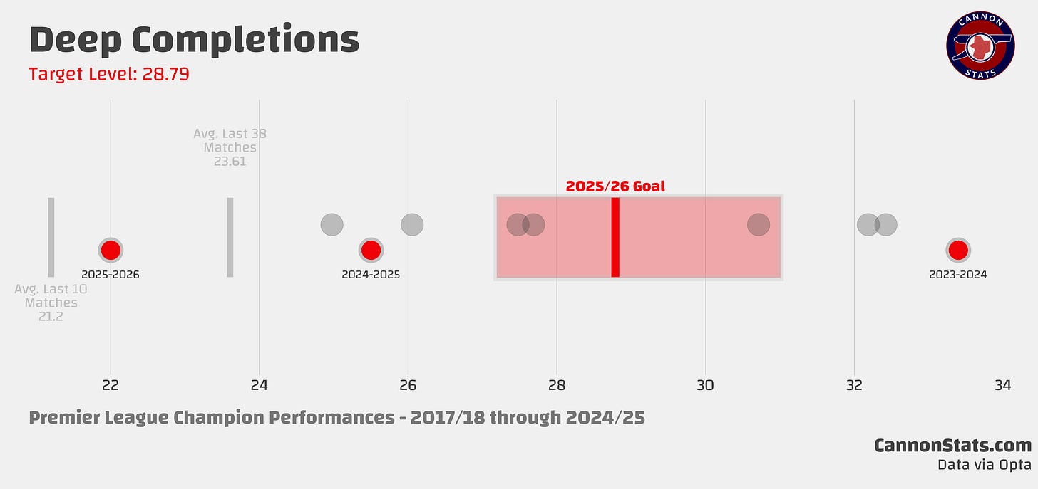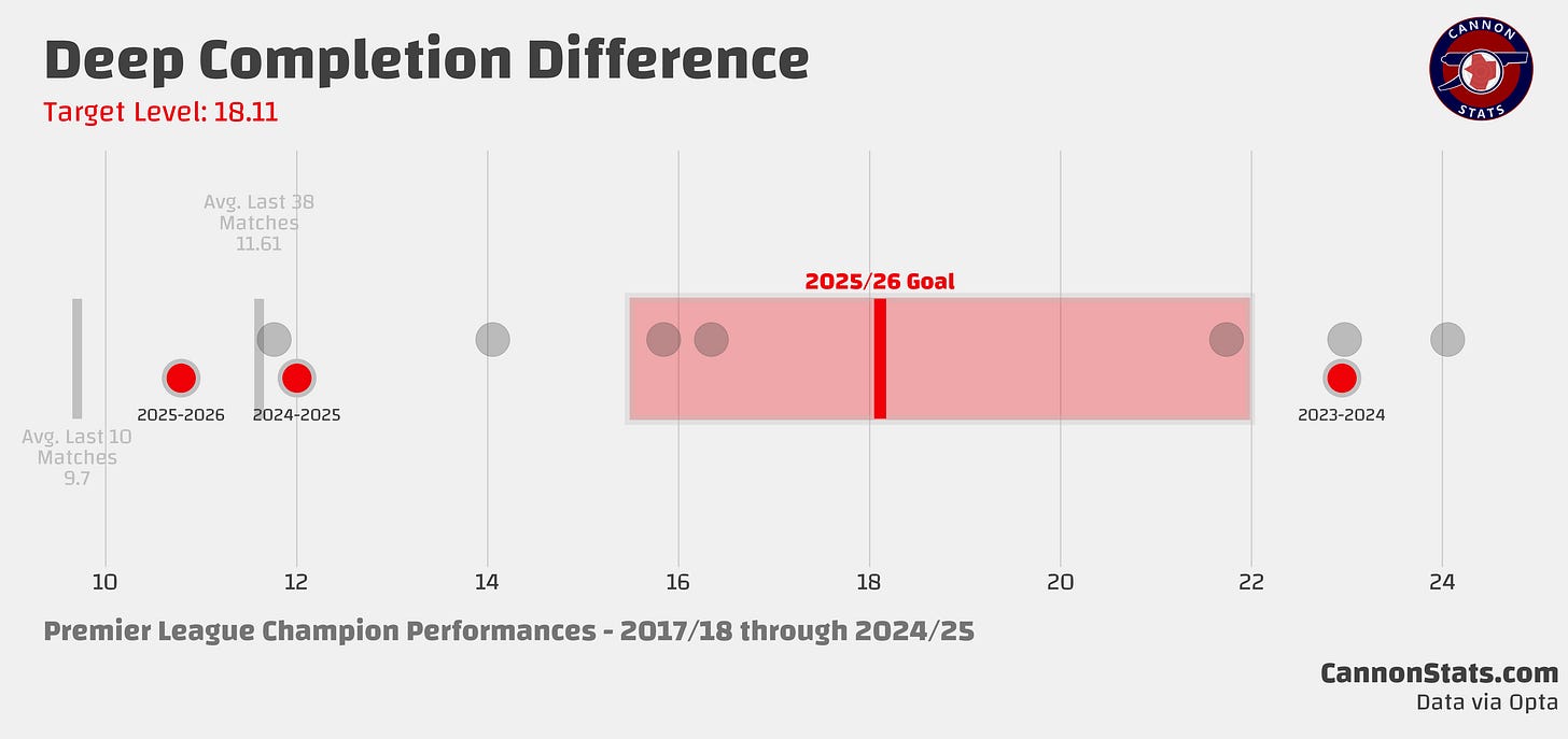 If you’re new here, before the season I go through the key stats (points, goals, expected goals, deep completions, open play shots, and field tilt) and set a baseline for what I would consider a success. These are based on historical performances, and they are set at what teams who have won the title have done. The expectations are high but that is what required to win the title.