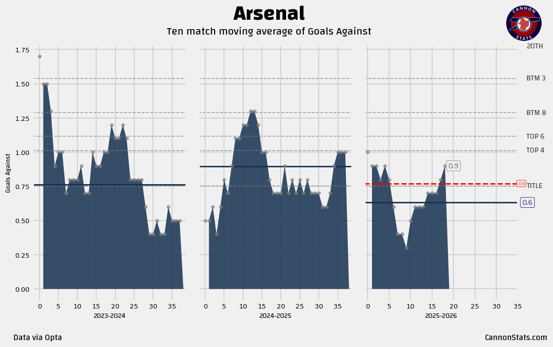➡️ Arsenal’s goals allowed pace has taken a bit of a hit over the last month, the team has given up late goals and managed just 2 clean sheets in the Premier League out of five played.