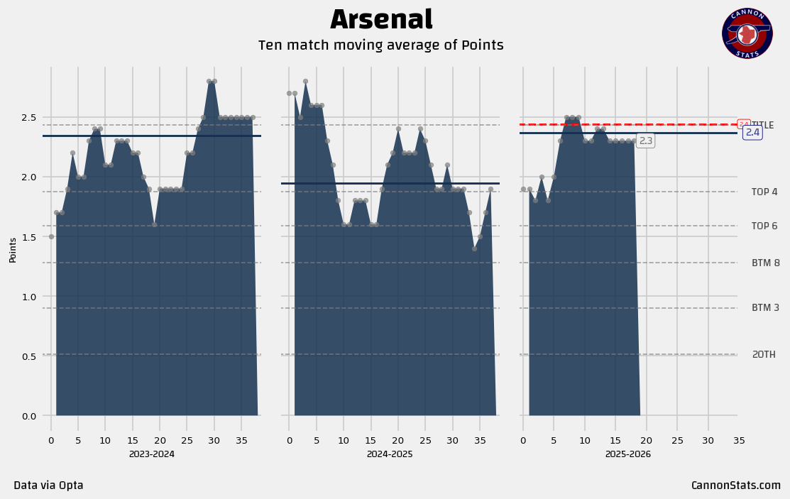 ↗️ Arsenal are on top of the table on 90-point pace. It’s hard to be less than thrilled with how Arsenal’s results have gone thus far, especially given that it has been another season tested by injury.