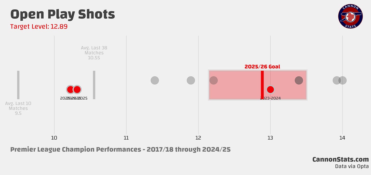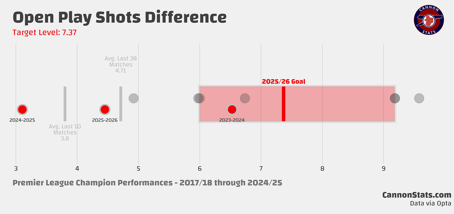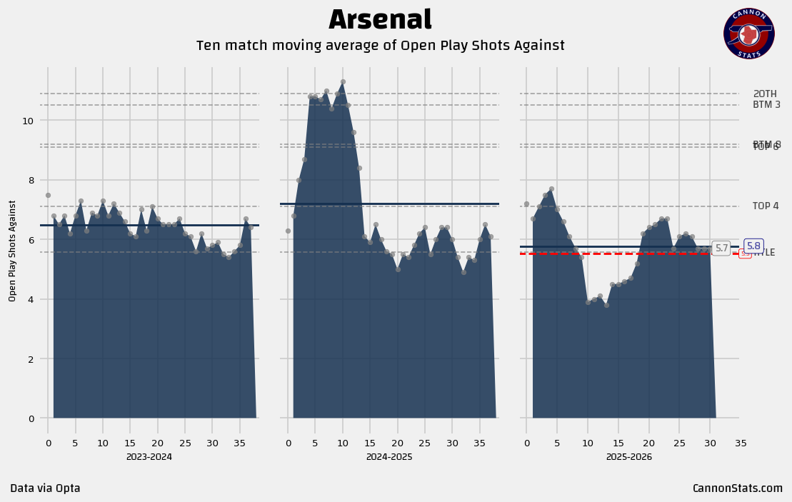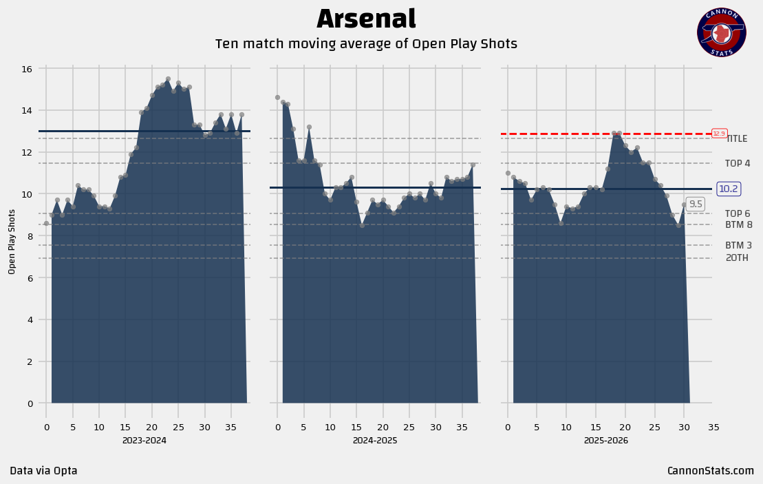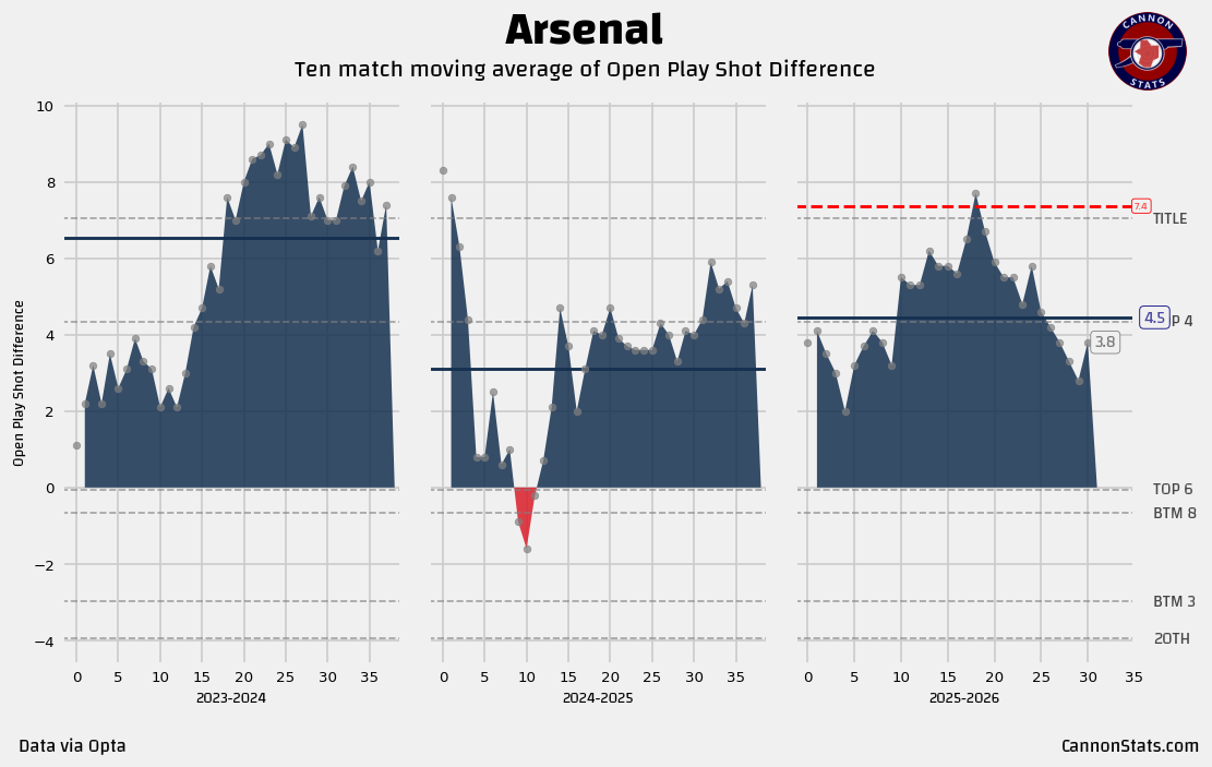 This has improved as the season has progressed but overall, the shot volume, especially from open play, has been a major outlier compared to previous League winners and even within the League this season Arsenal rank just 4th.