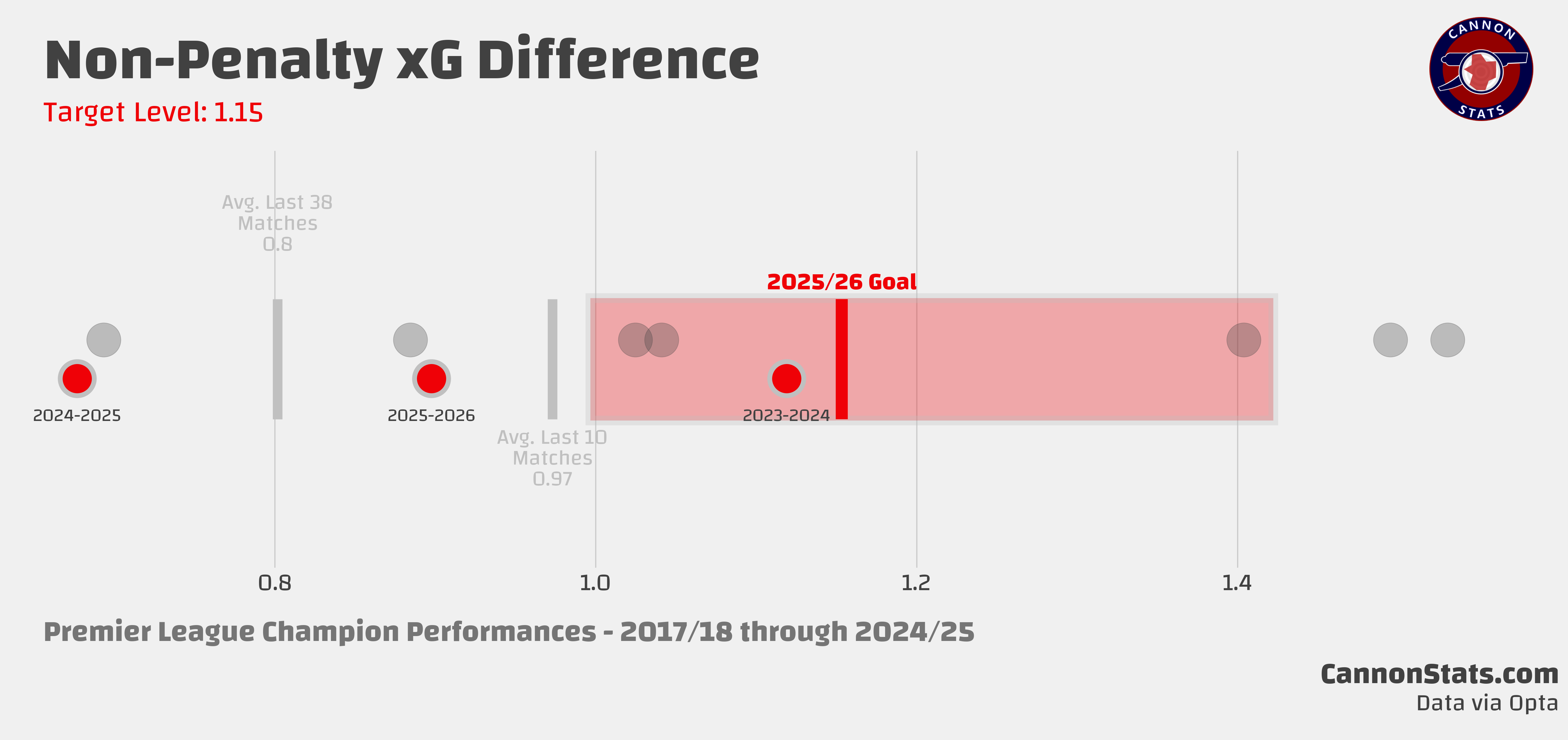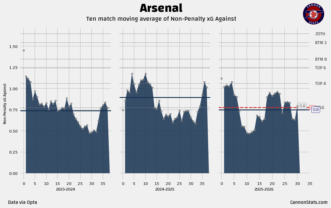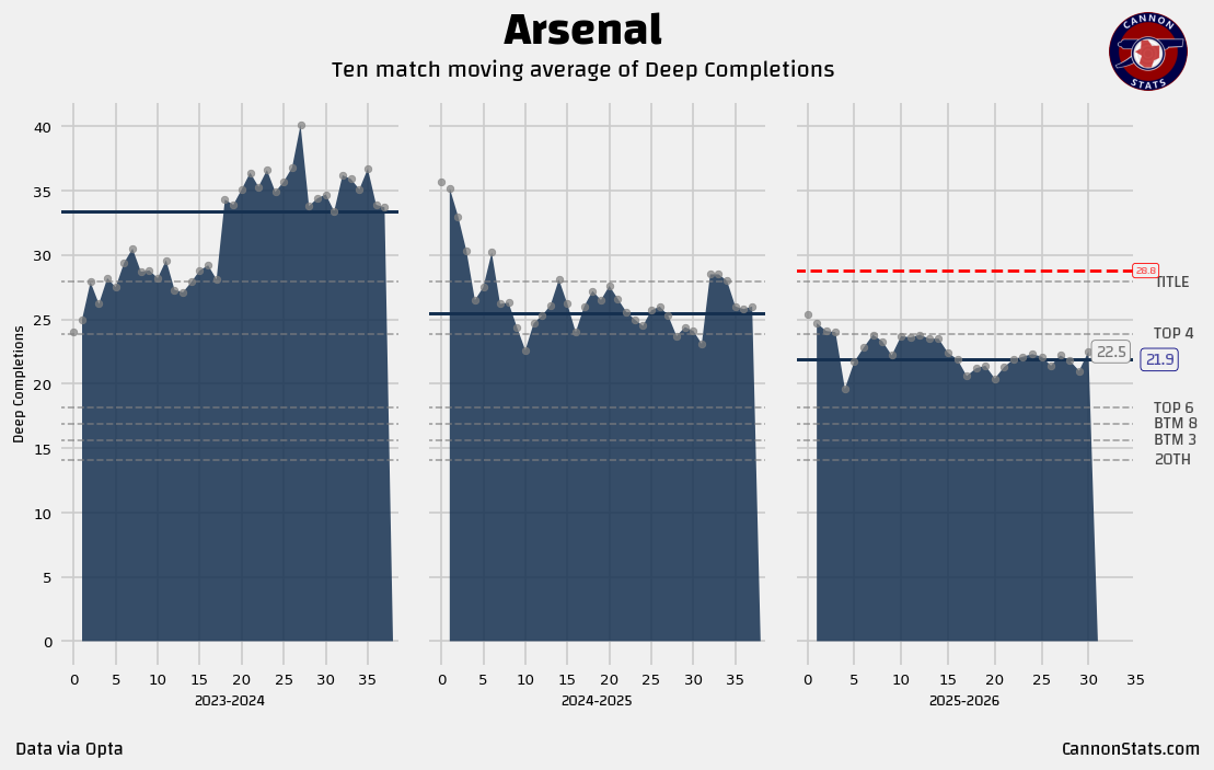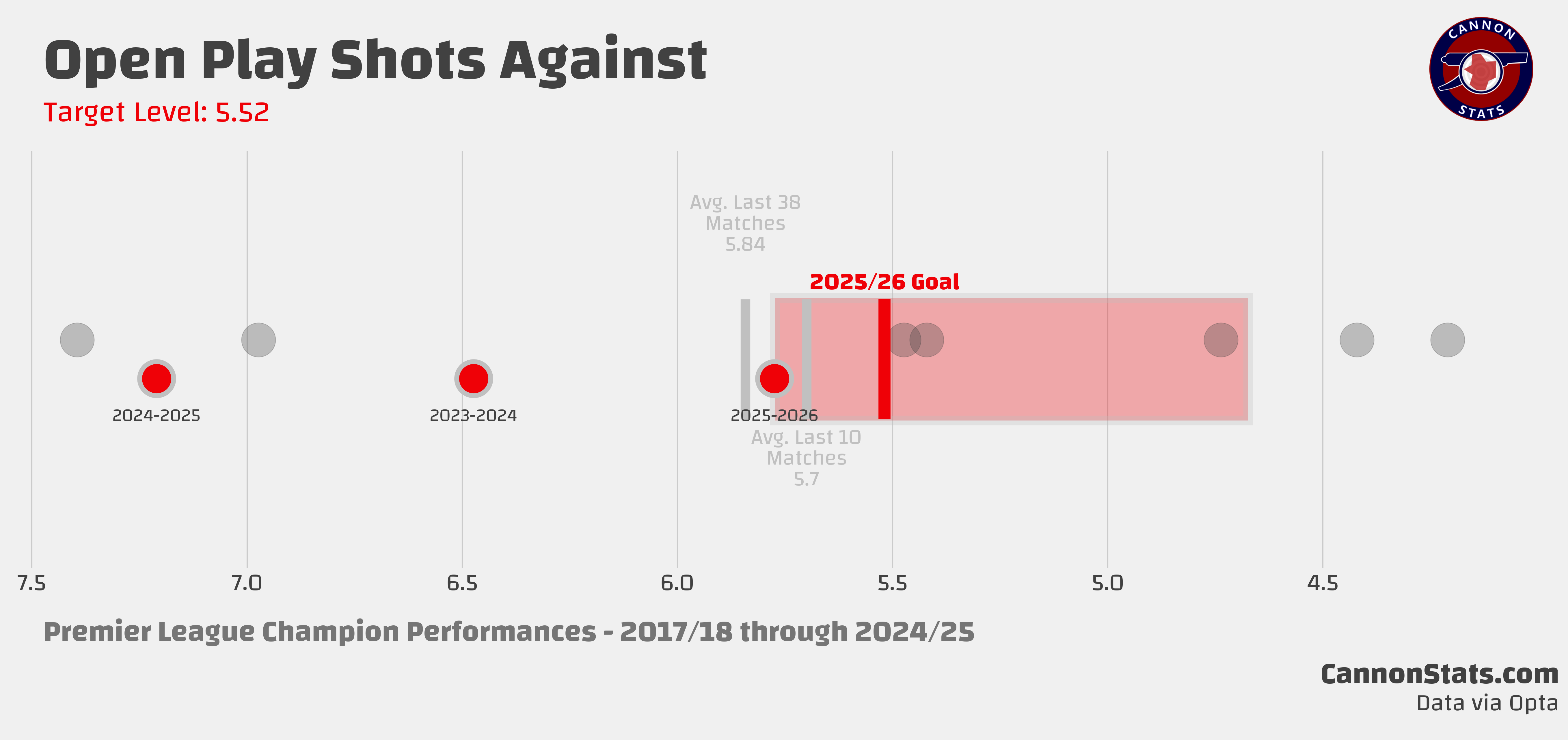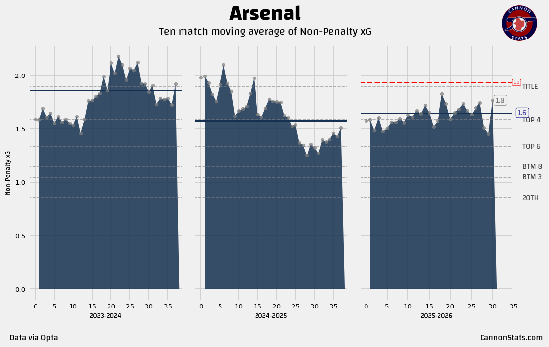 This has improved as the season has progressed but overall, the shot volume, especially from open play, has been a major outlier compared to previous League winners and even within the League this season Arsenal rank just 4th.