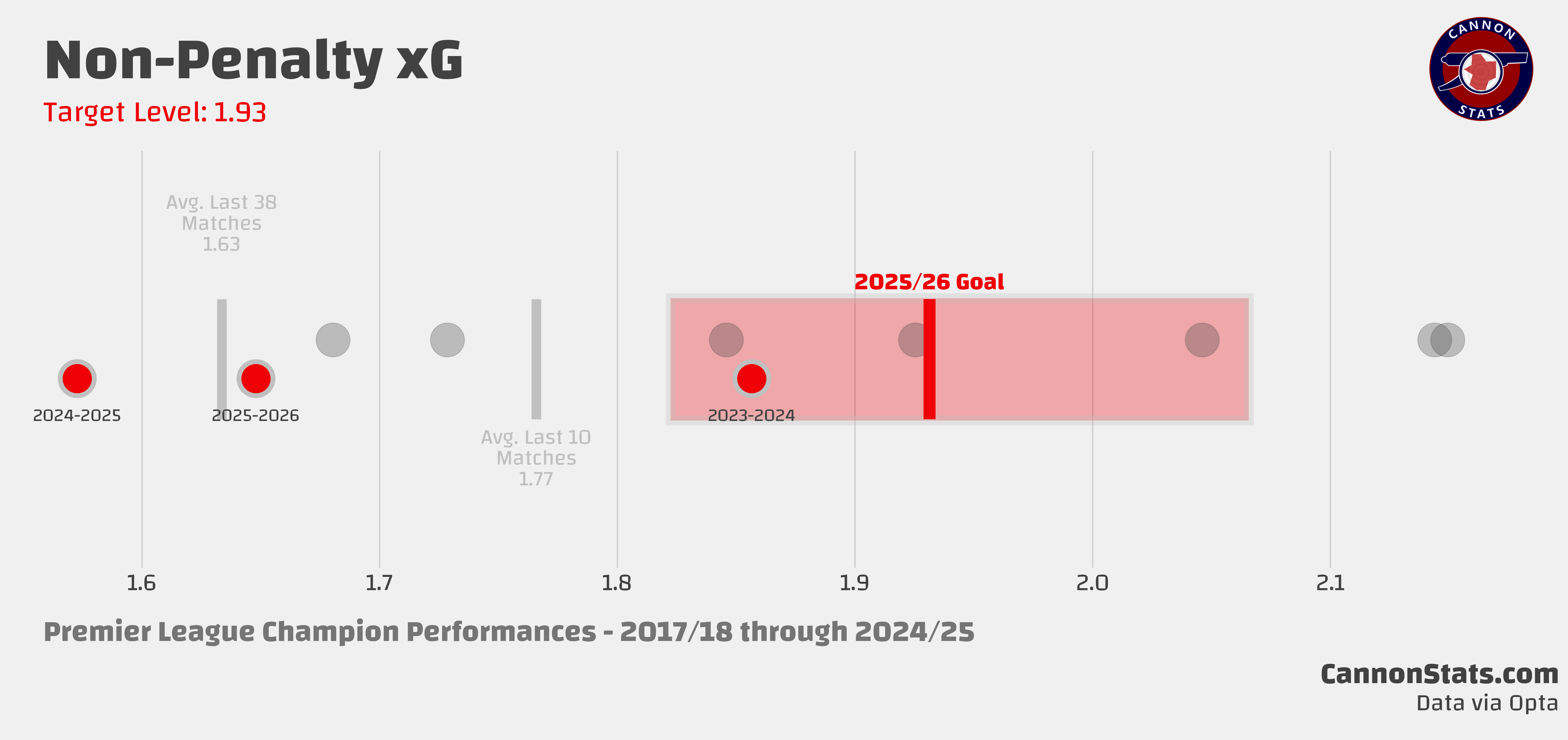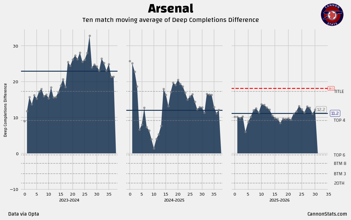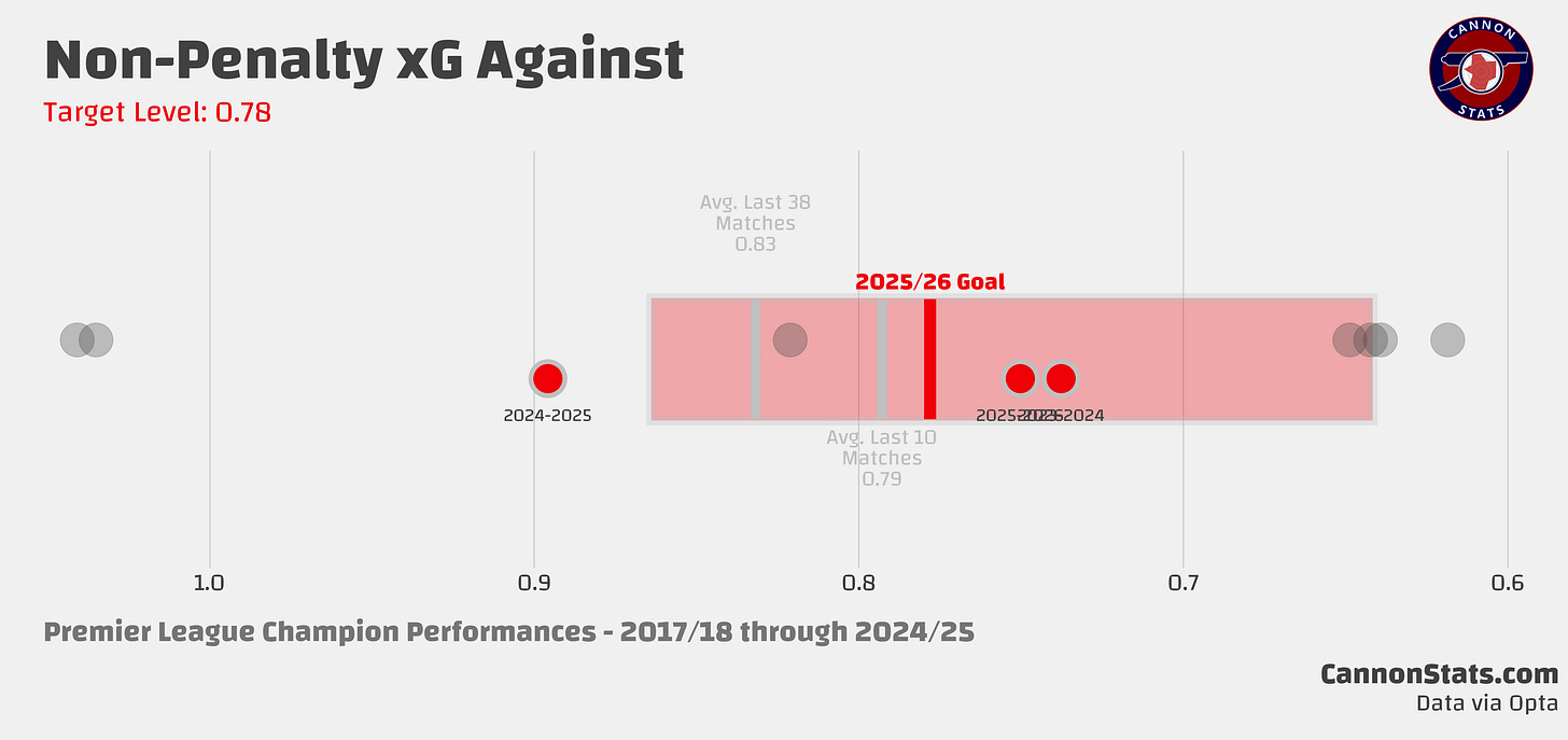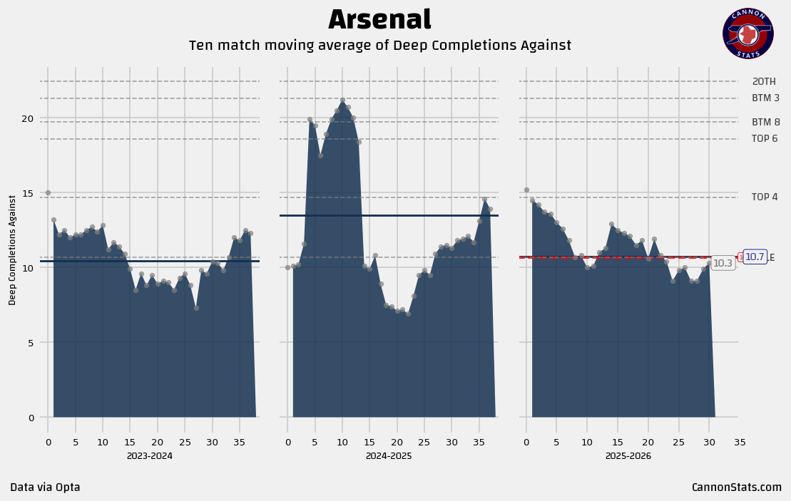This has improved as the season has progressed but overall, the shot volume, especially from open play, has been a major outlier compared to previous League winners and even within the League this season Arsenal rank just 4th.