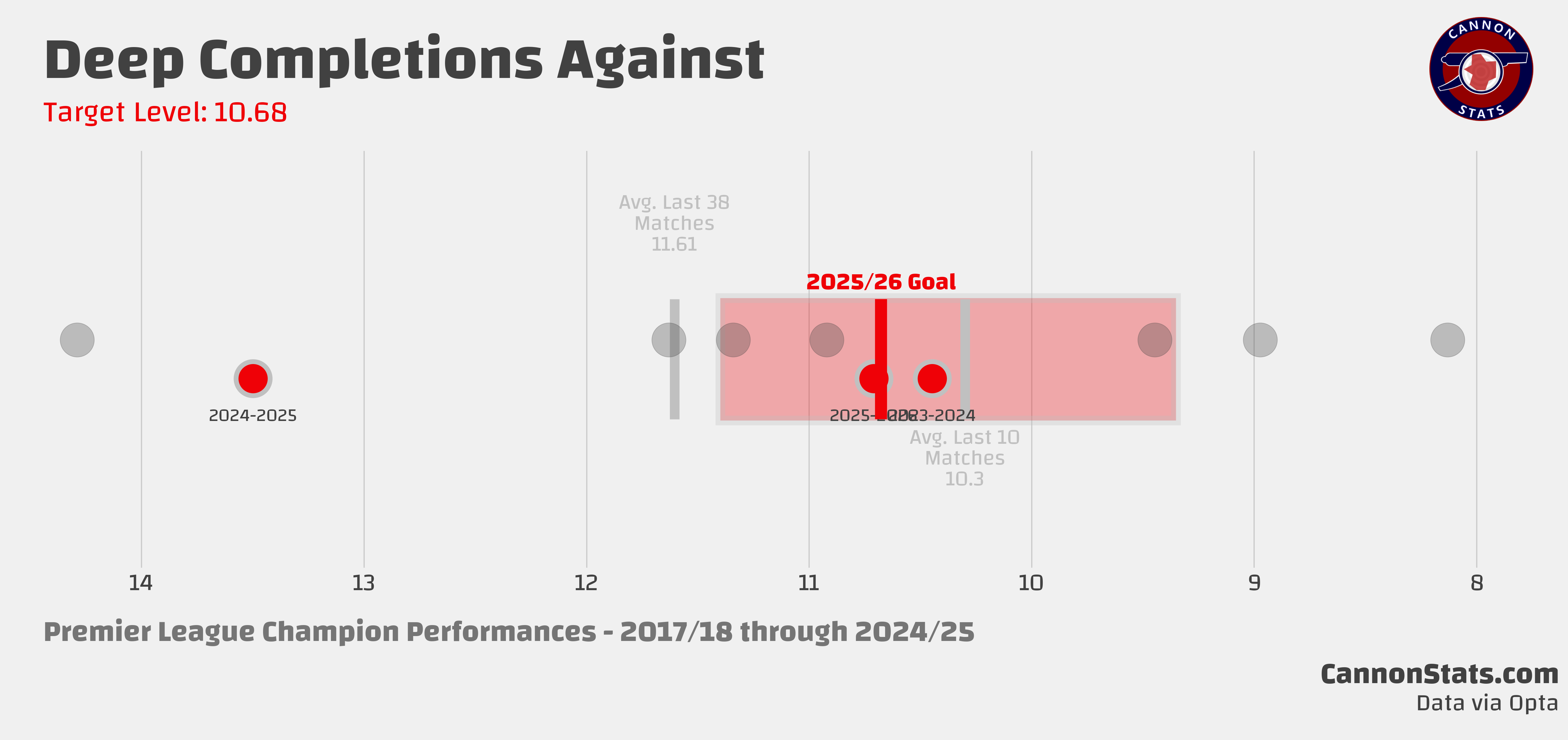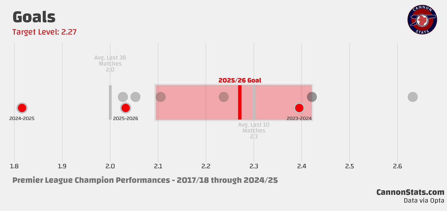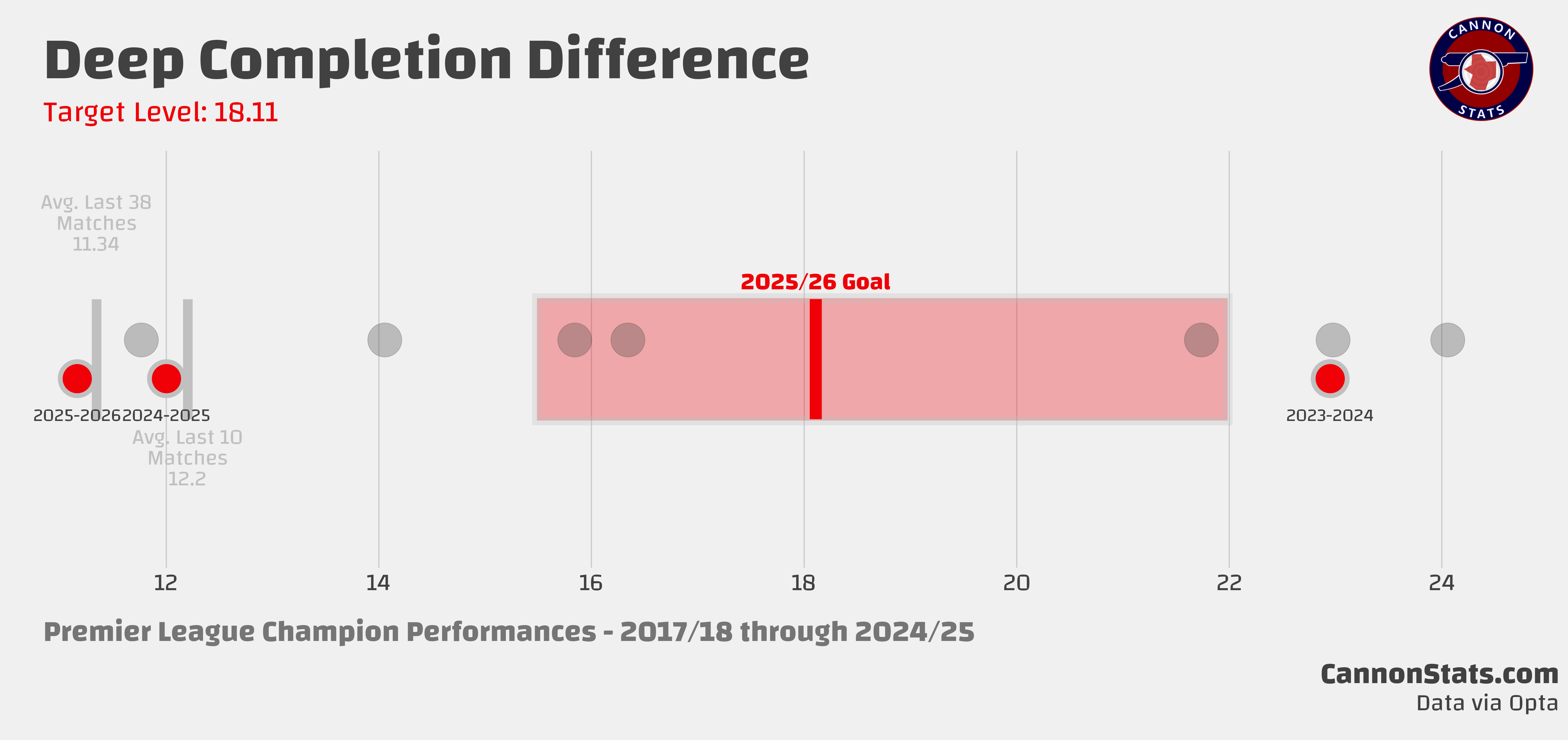 If you’re new here, before the season I go through the key stats (points, goals, expected goals, deep completions, open play shots, and field tilt) and set a baseline for what I would consider a success. These are based on historical performances, and they are set at what teams who have won the title have done. The expectations are high but that is what required to win the title.