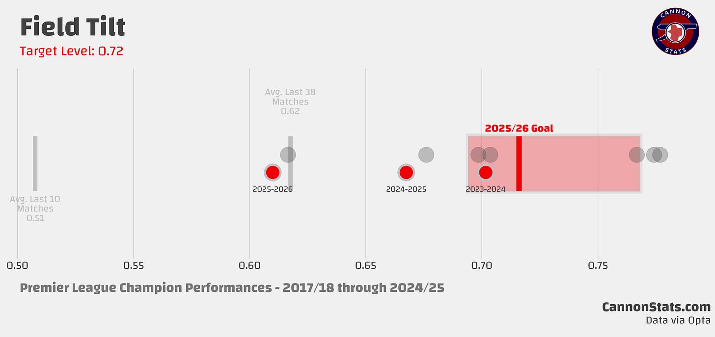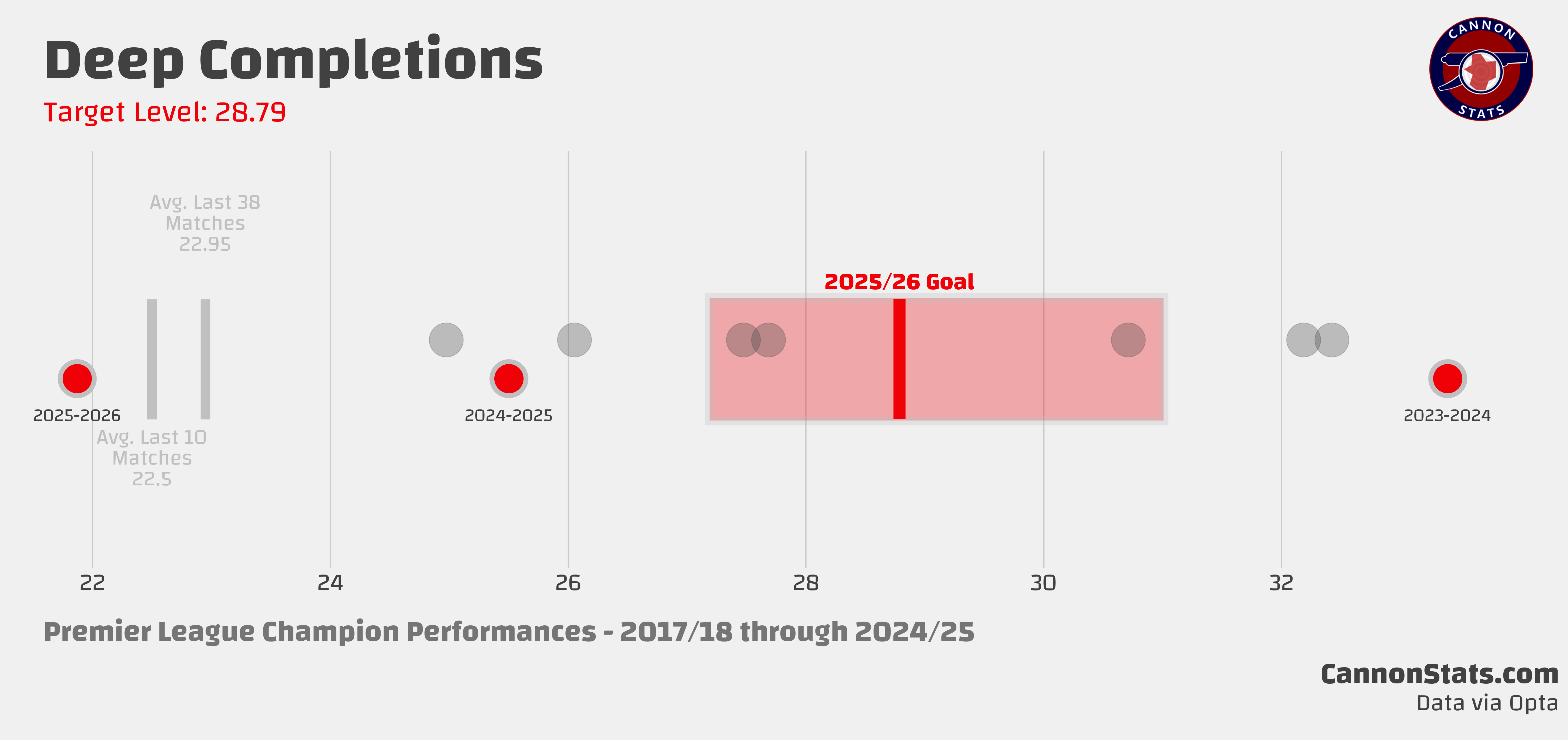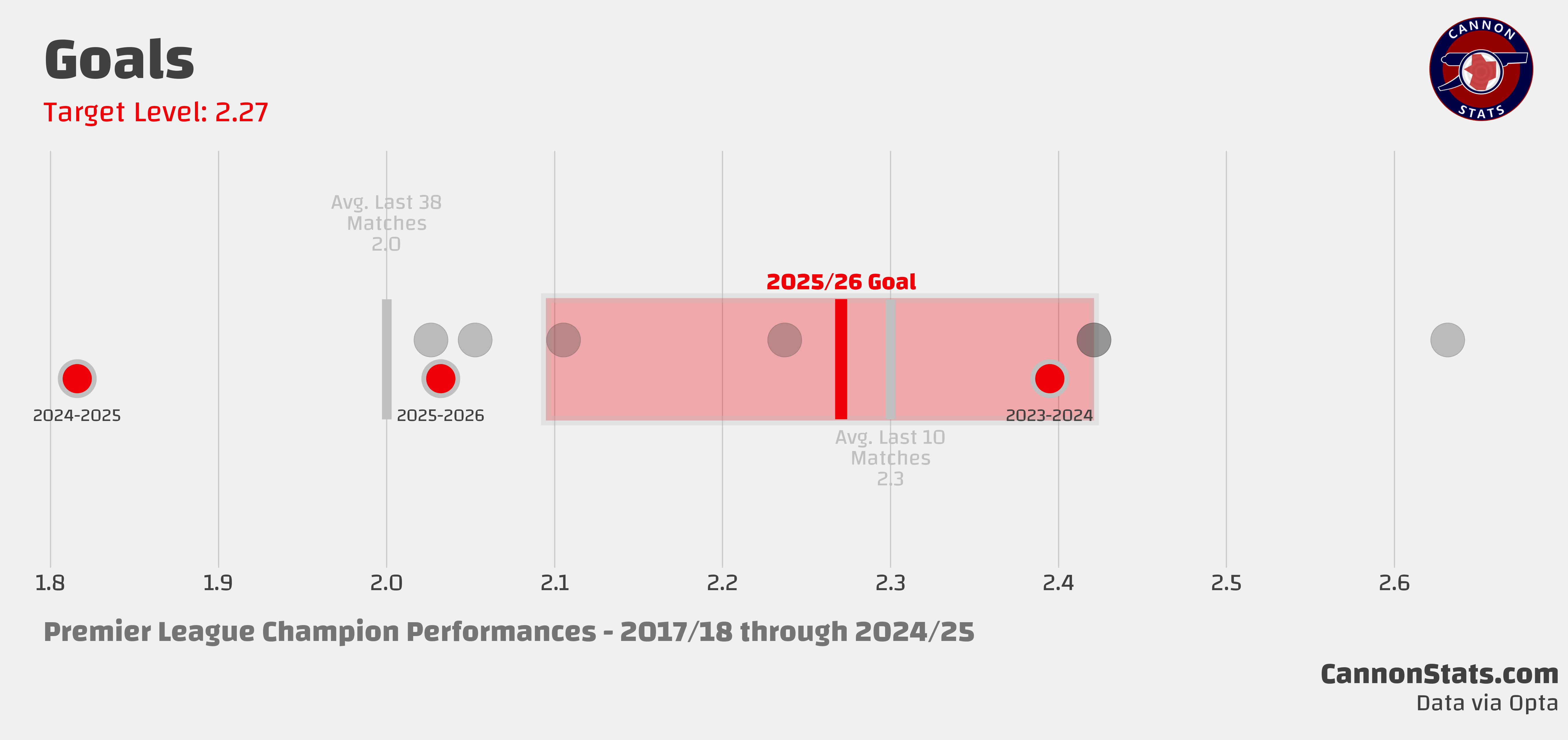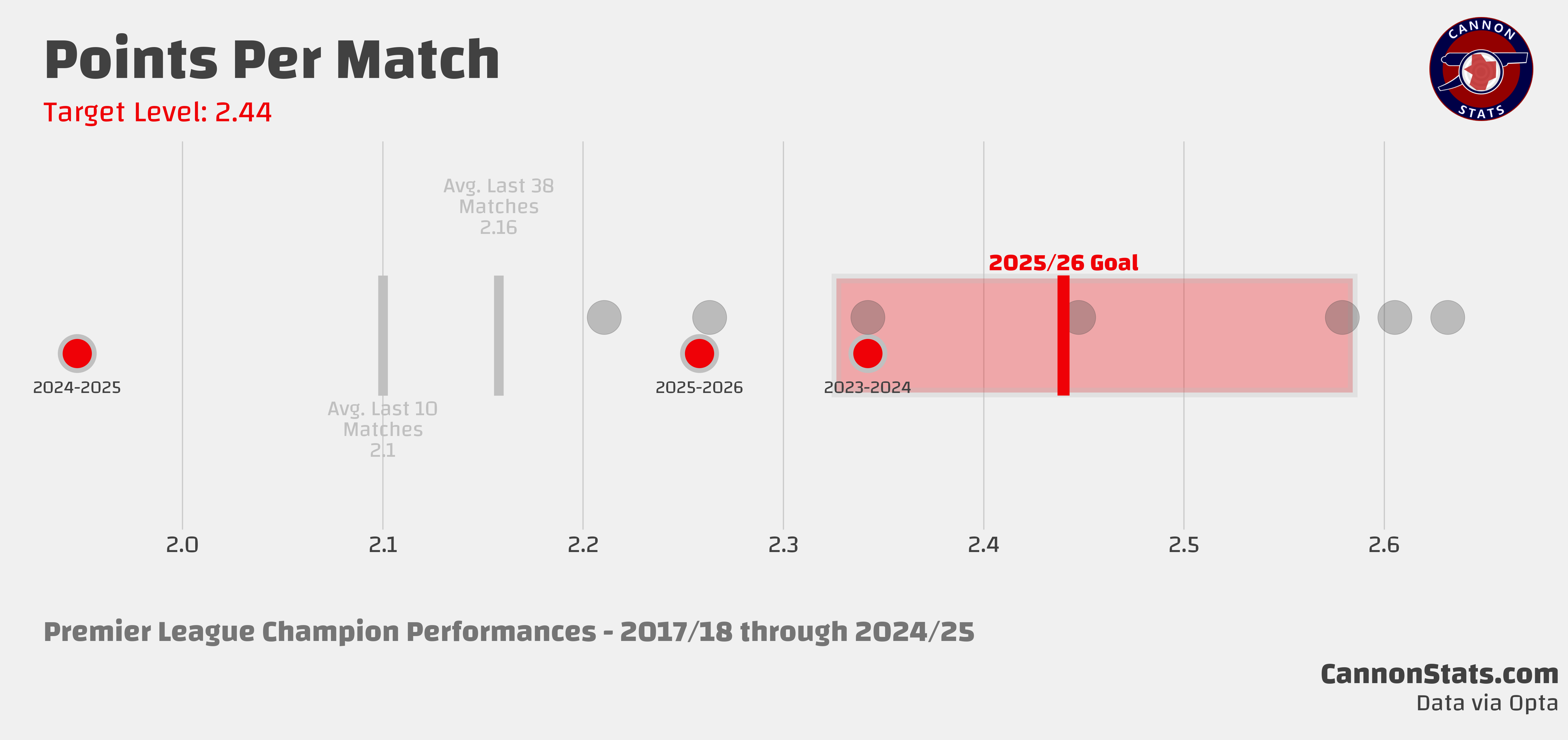 If you’re new here, before the season I go through the key stats (points, goals, expected goals, deep completions, open play shots, and field tilt) and set a baseline for what I would consider a success. These are based on historical performances, and they are set at what teams who have won the title have done. The expectations are high but that is what required to win the title.