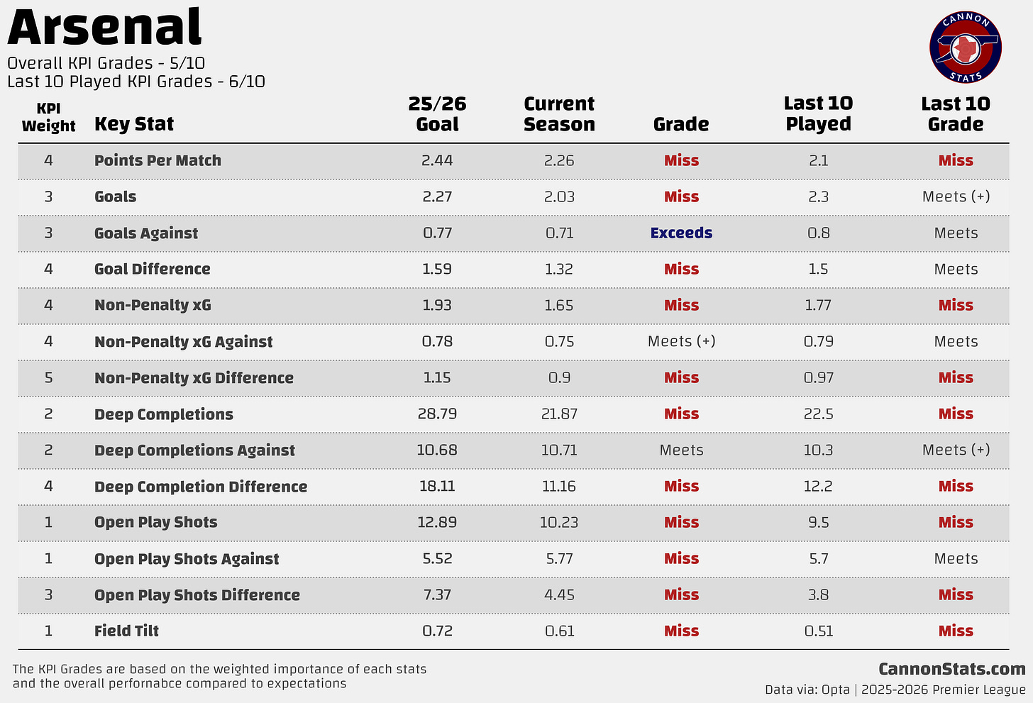 Checking in on how Arsenal are performing compared to the Key Performance Indicators for the 2025-26 season