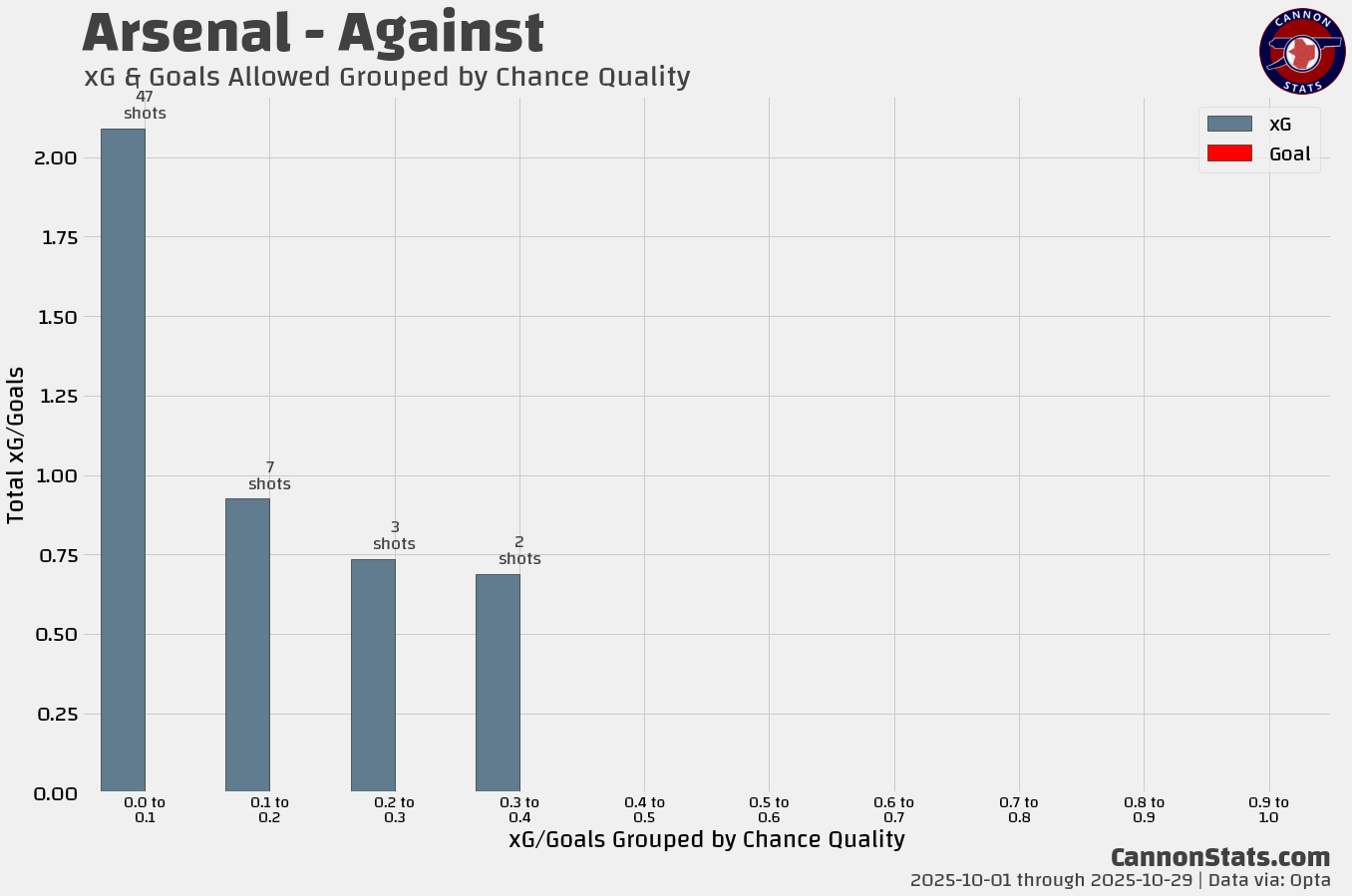 Some of this is down to poor finishing by the opposition, but there has also been excellent at blocking shots as well with 19 of the 59 blocked. Arsenal have also done an excellent job of limiting the quality of the shots that the opposition has taken.