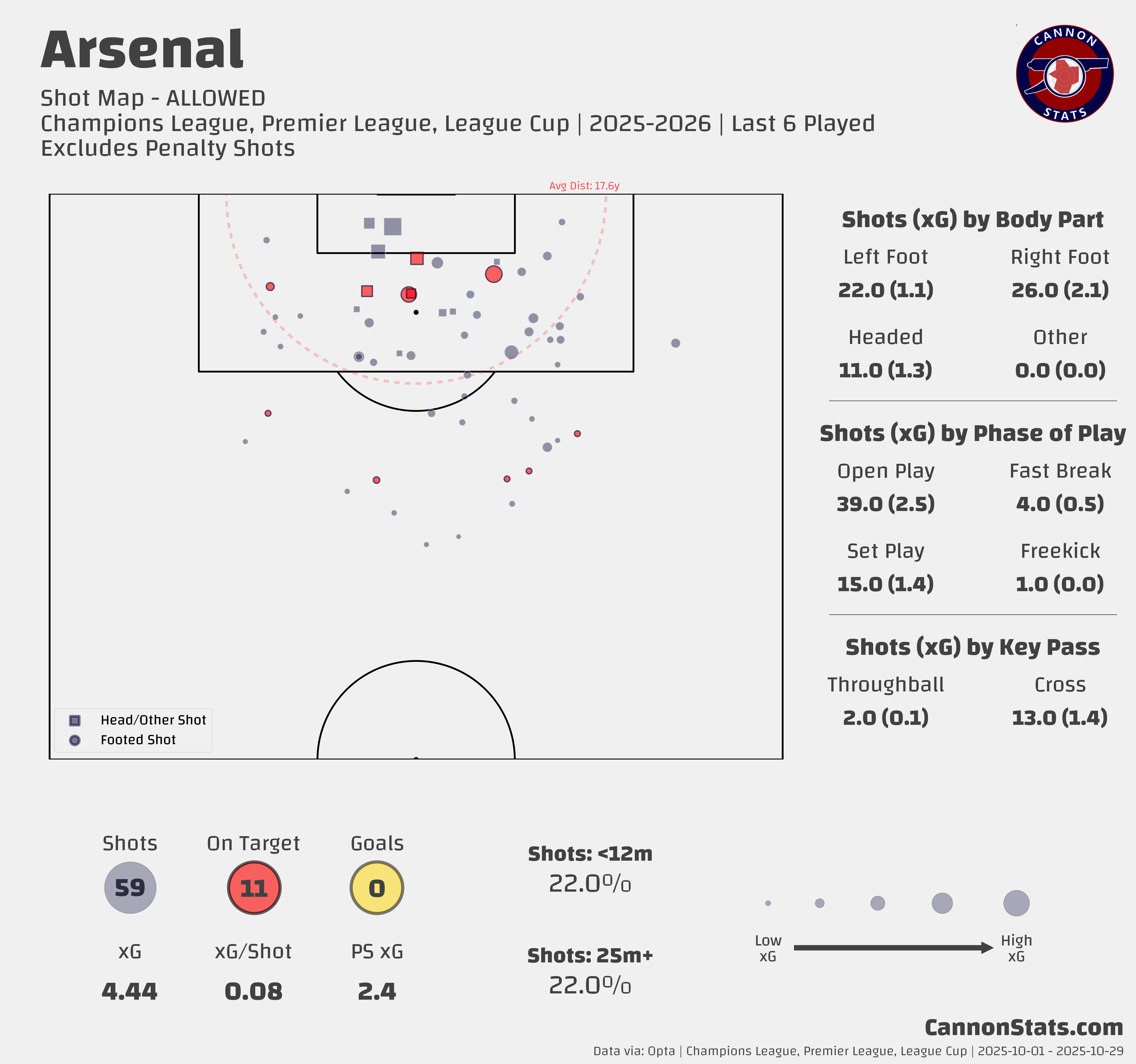 - 11 shots on target allowed, 1.8 per match with 4 matches where Arsenal held the opposition to just 0 or 1 on target