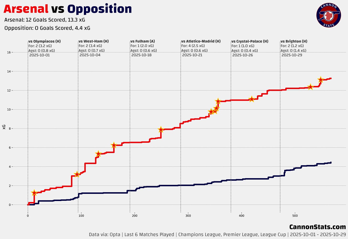 Overall, it was 12 to 0 on goals and 13.3 to 4.4 on xG.