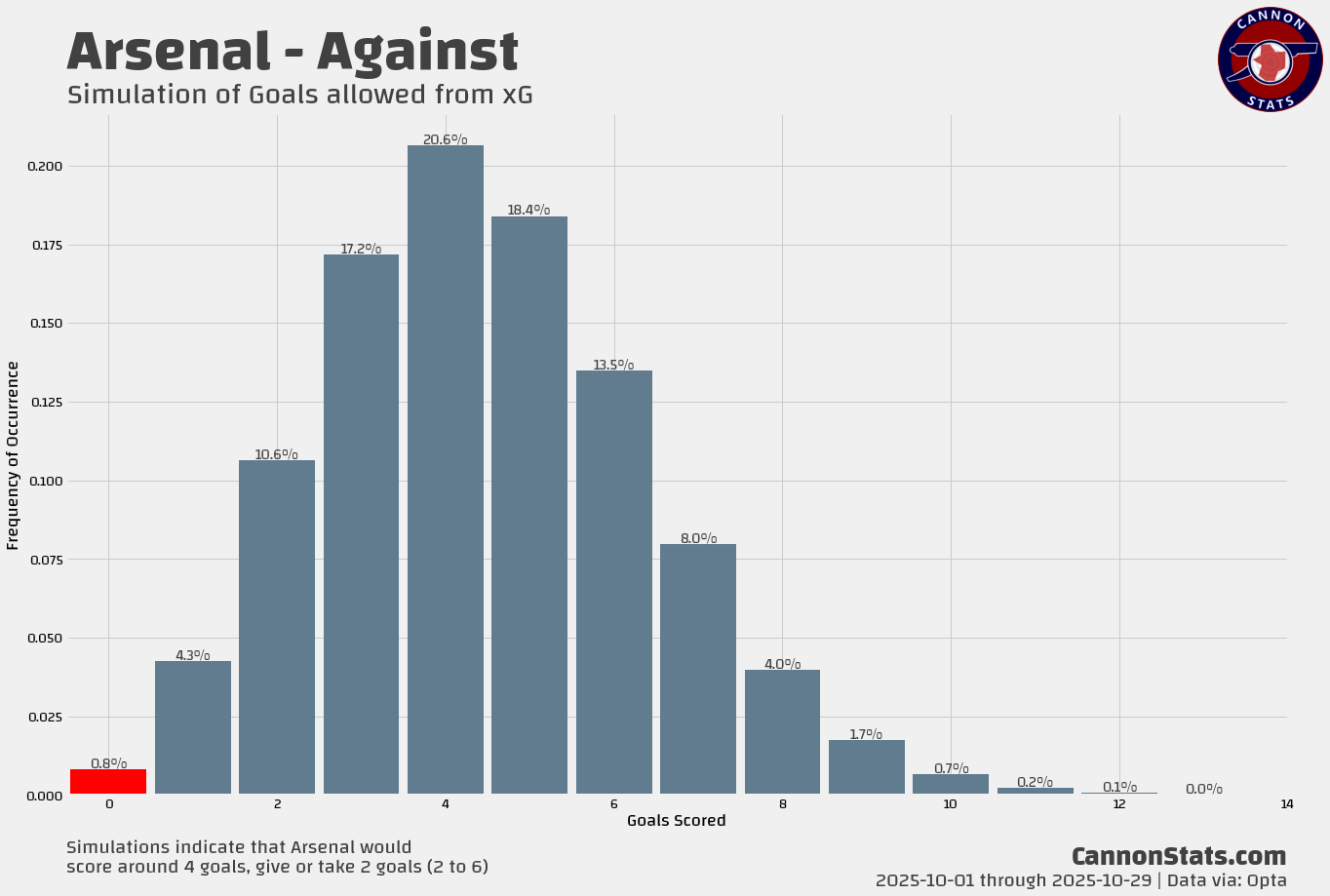 Arsenal are running a bit hot right now on limiting goals. Looking at the simulation of goals allowed, coming through this without conceding is roughly a 1% outcome.