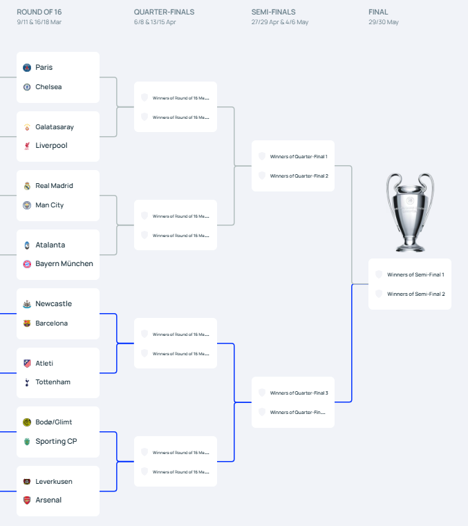 The Piero Hincapié Derby is on! Arsenal drew Bayer Leverkusen in the UEFA Champions League round of 16 this morning, also being drawn into the blue path. That sets up a Champions League bracket that looks like this: