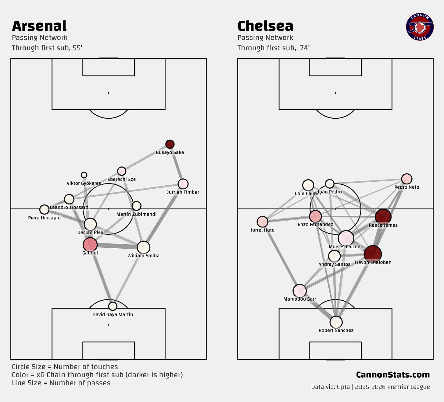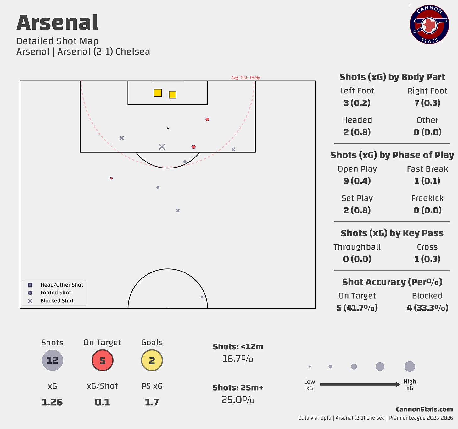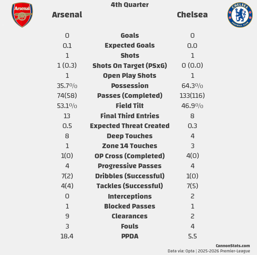 They had a single shot (Caicedo) and dangerous cross that was well delivered into the zone of uncertainty. The cross was the most dangerous moment but saw Arsenal execute like you’d expect from the best defense in the League. The cross was well defended by Gabriel to not let João Pedro make a play on the ball and it did force Raya to push it away dramatically, after he held his position reading the play, reacting late to the ball.
