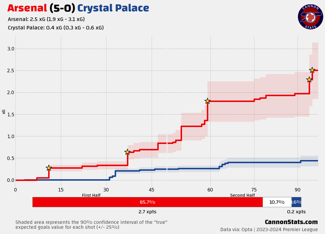 There were still times that Crystal Palace got into shape and forced Arsenal to try and break them down but here, Arsenal were able to counter that with speed. Getting the early goal certainly helped but that still probably didn’t change the game plan too much for the visitors, they just couldn’t slow Arsenal down.