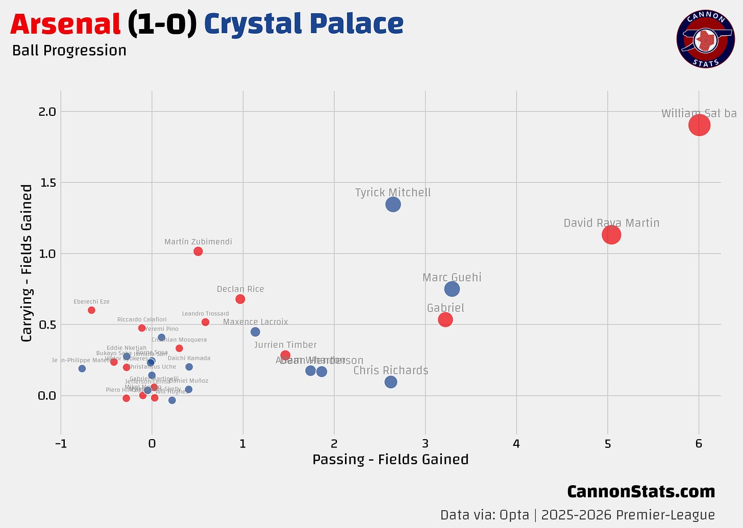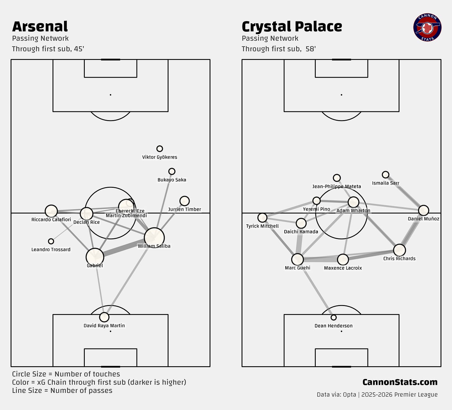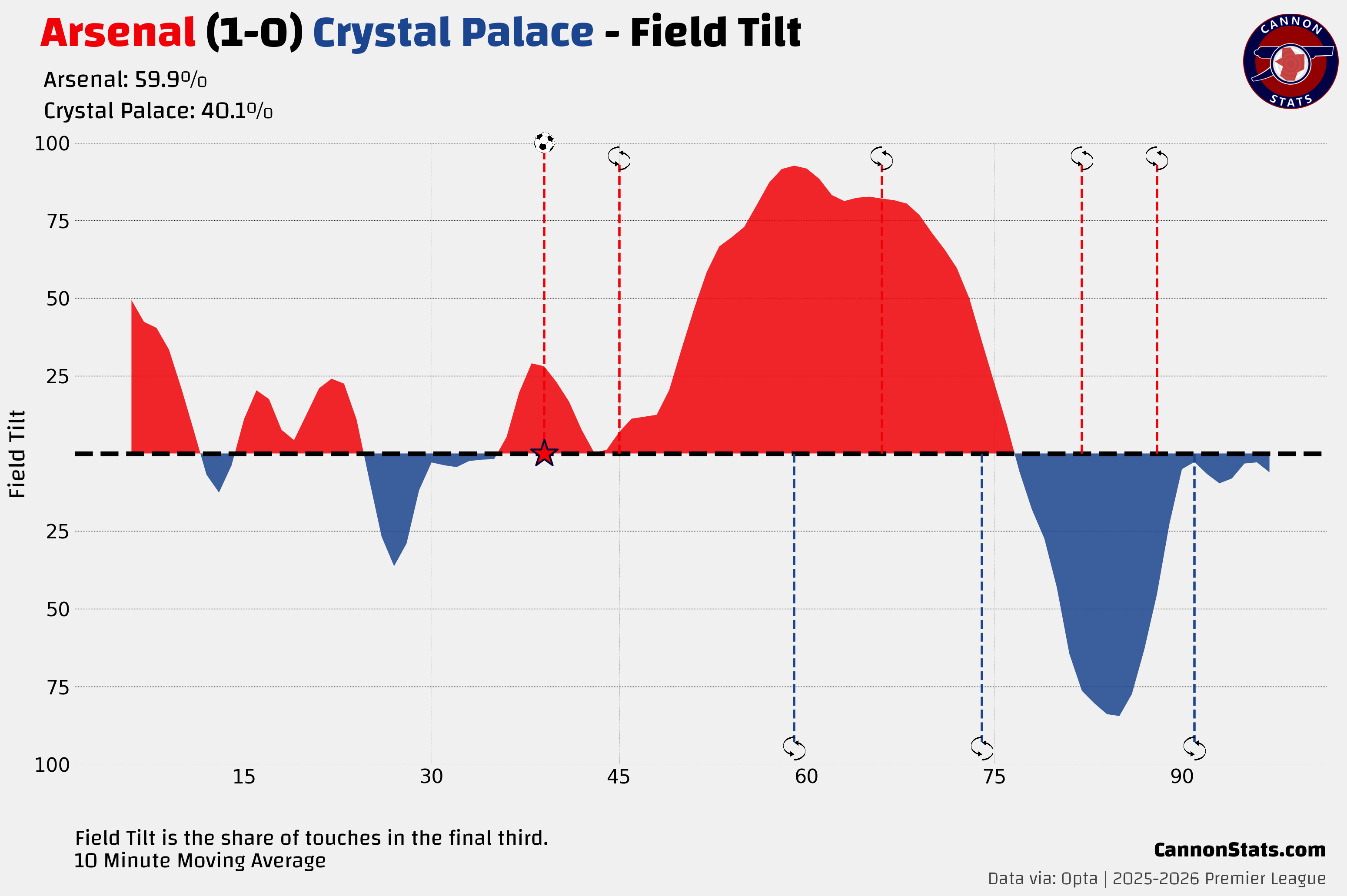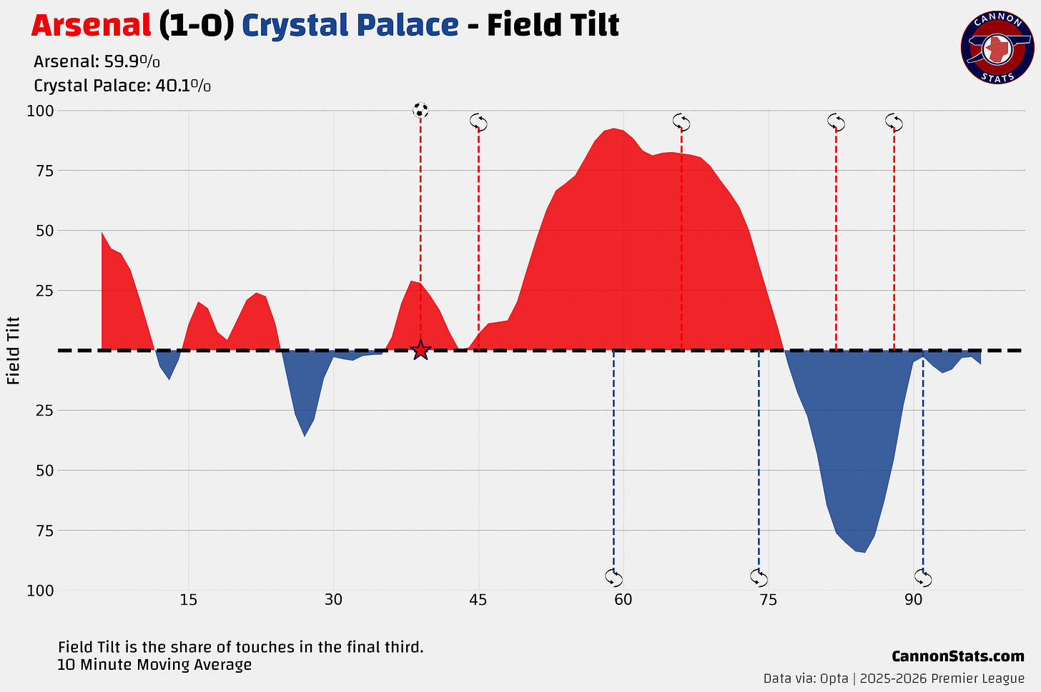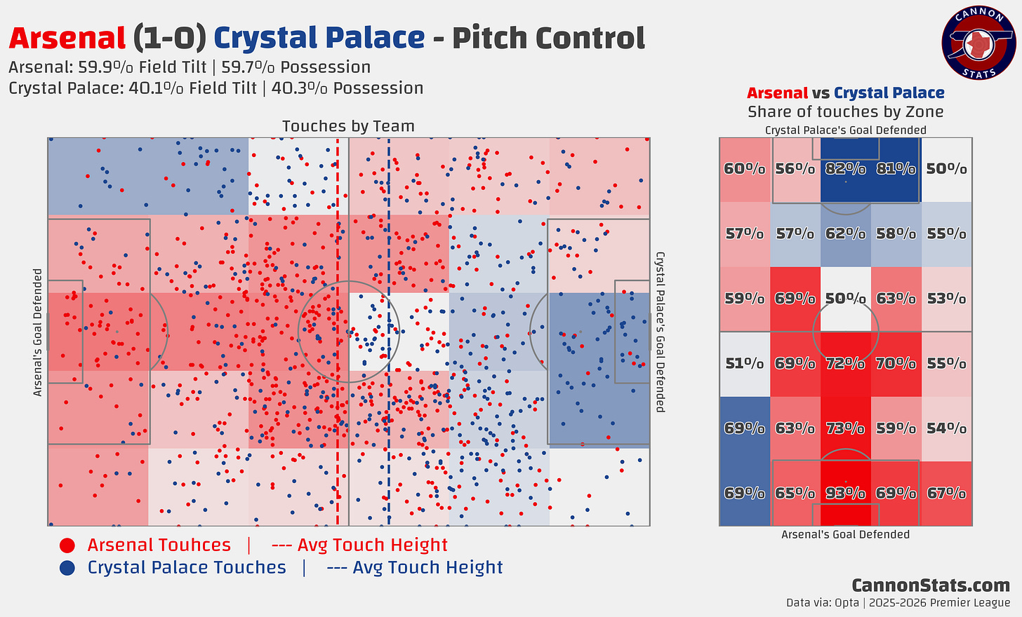 Looking at all of the touches and the overall share of touches hammers this home. Arsenal had a bit more play in the final third but not so much that they overwhelmed or piled on the pressure on Crystal Palace. Crystal Palace, even when they were able to get a bit more a foothold in this match, did not or could not get the ball near Arsenal’s goal with any regularity.