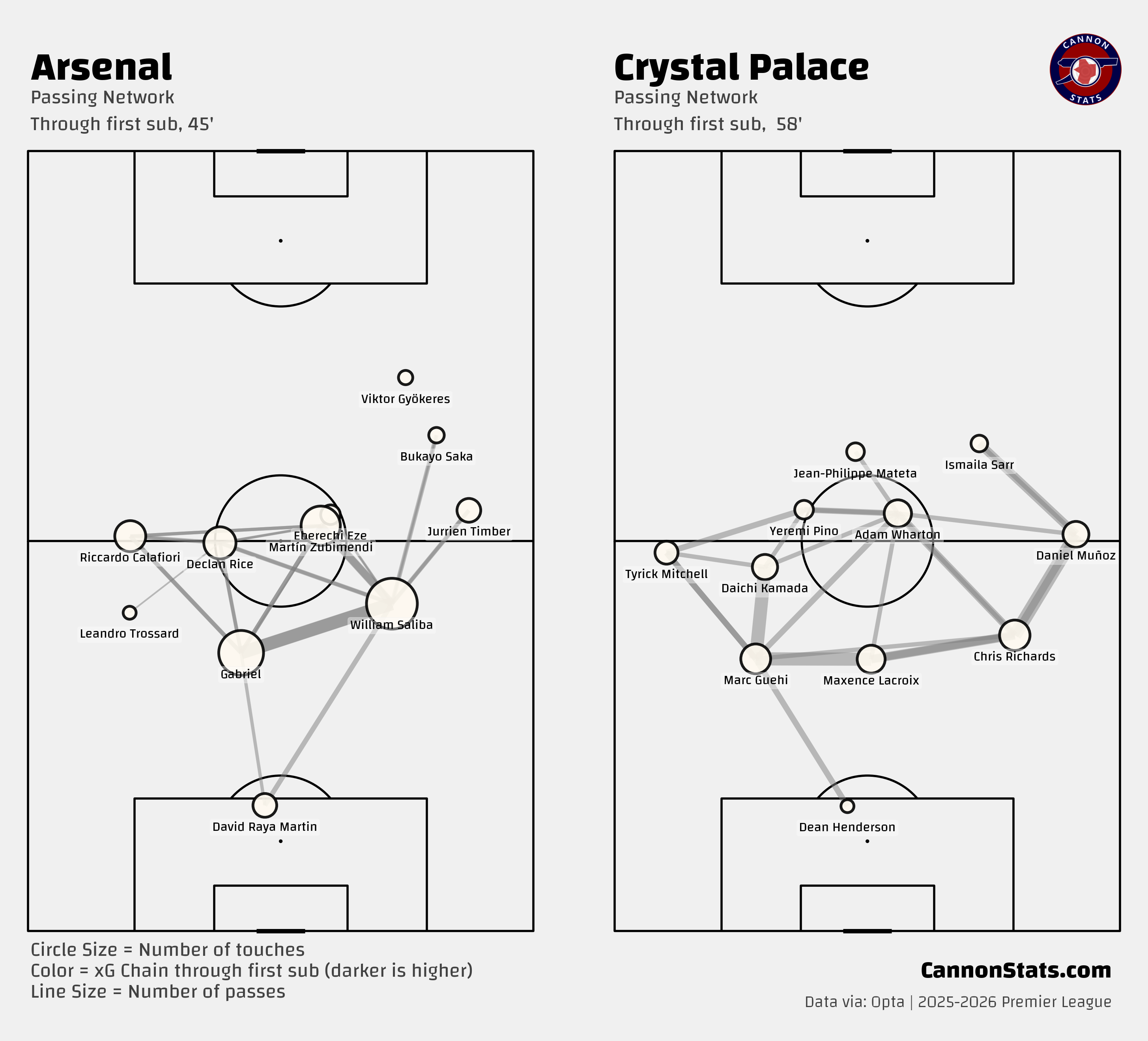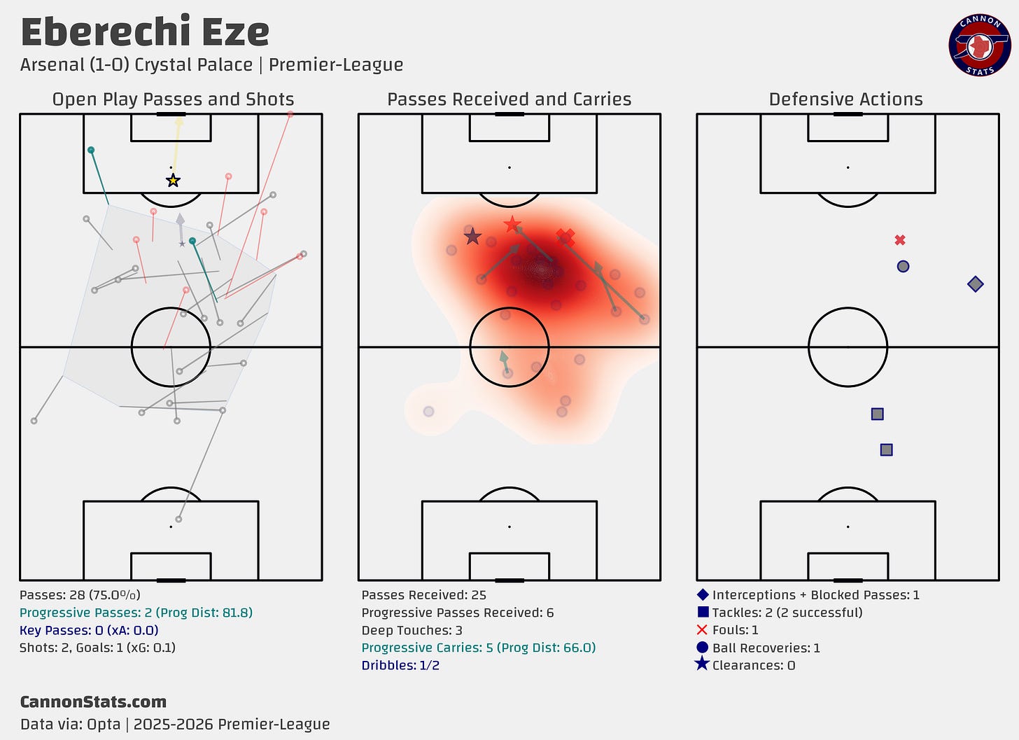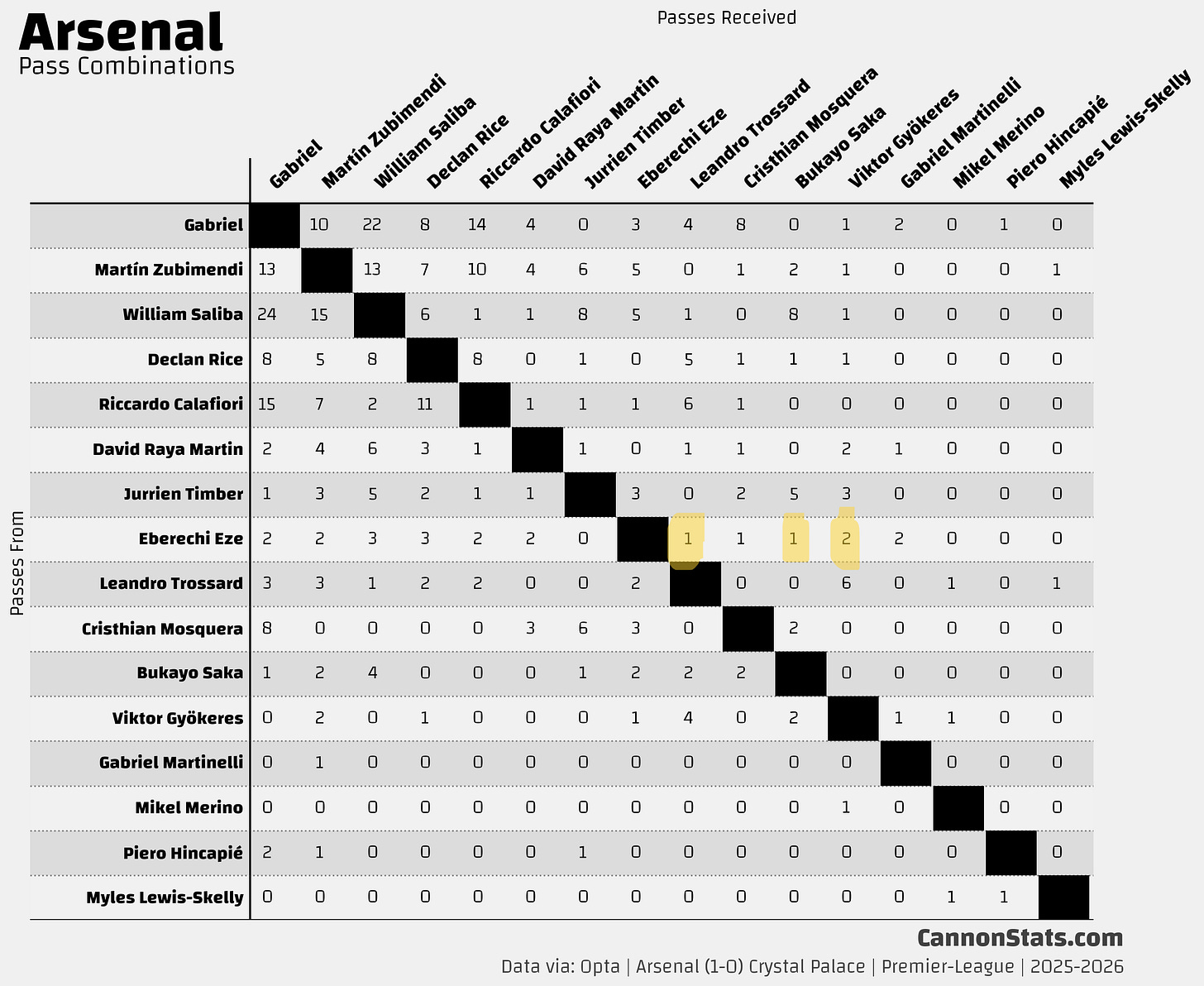 One of the places that this shows up is that Eze’s pass combinations to the starting attackers was just 4 passes completed in this match, with just one pass completed to Bukayo Saka.
