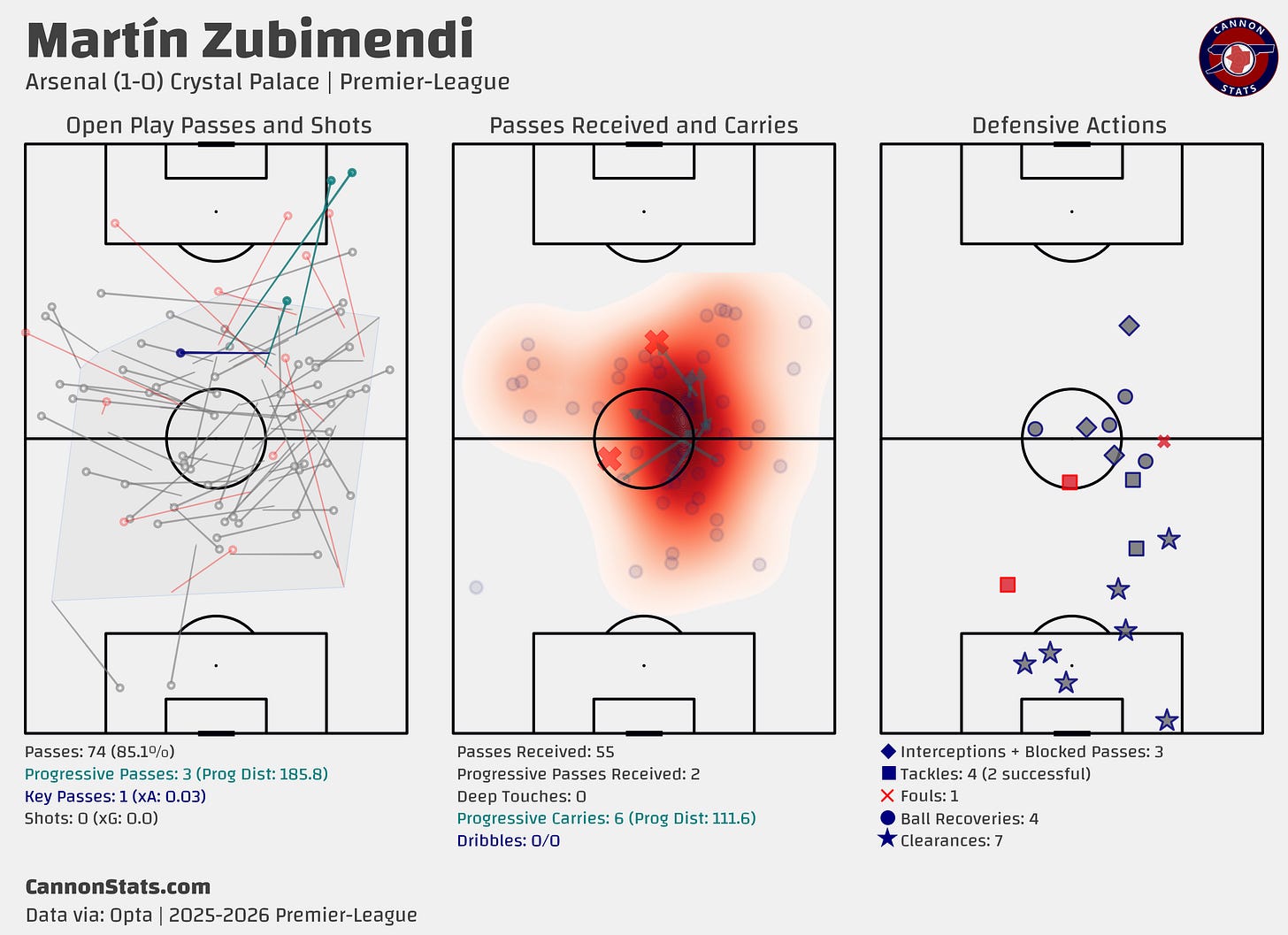Zubimendi had the most passes attempted in the middle third of the pitch but was not able to turn that into anything incisive and he had a few passes that were uncharacteristically off leading to some of the few transition chances that Crystal Palace had in this match.