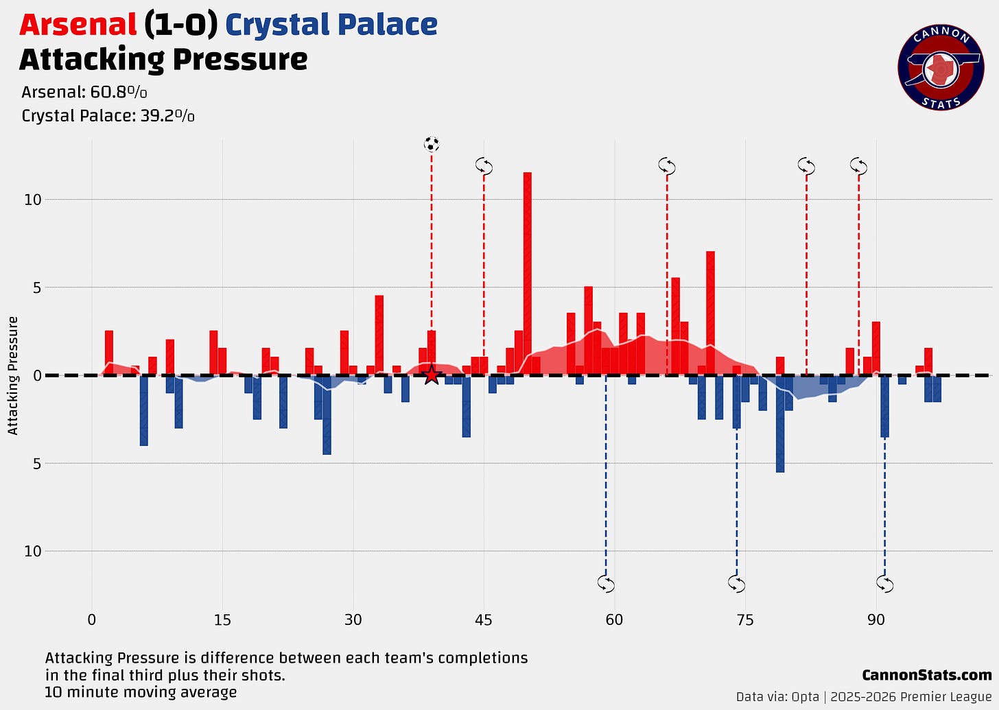 22% - Of the play in this match happened in Arsenal’s attacking third, the lowest share of any match for Arsenal this season.