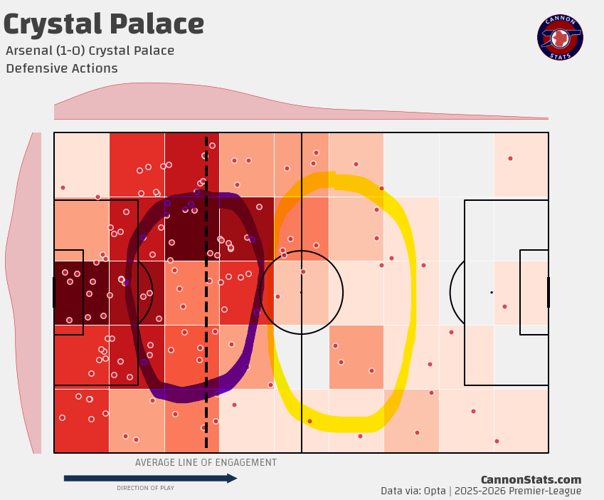 In this match, Crystal Palace mostly did not take the bait coming on to Arsenal. Looking at the defensive actions, they seemed generally content to let Arsenal’s midfielders and center backs pass it around in the area around the halfway line. They did cut out passing lanes effectively and in the rare occasions that there Arsenal did find their way centrally in the final third, swarmed effectively to turn the ball over.
