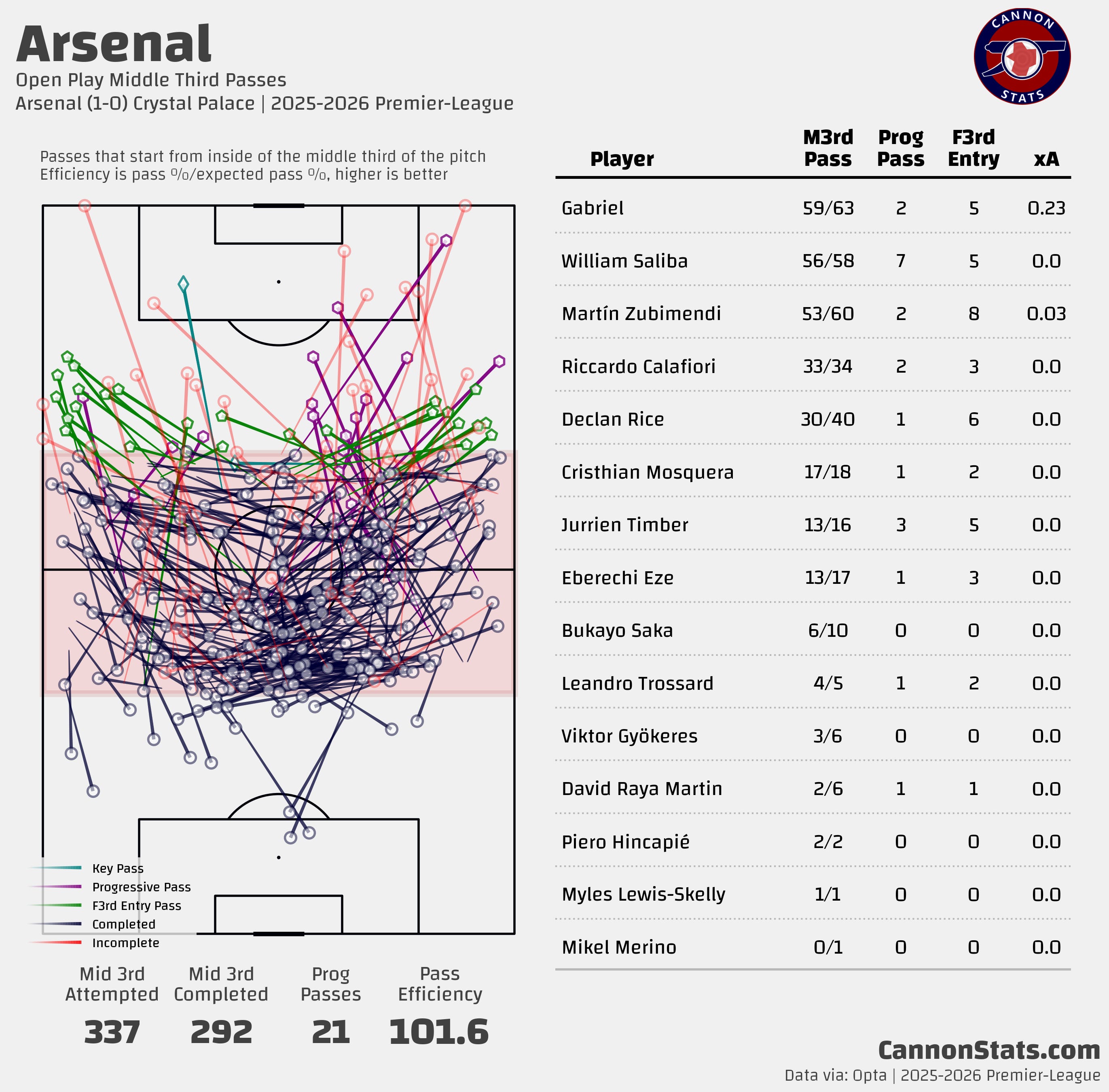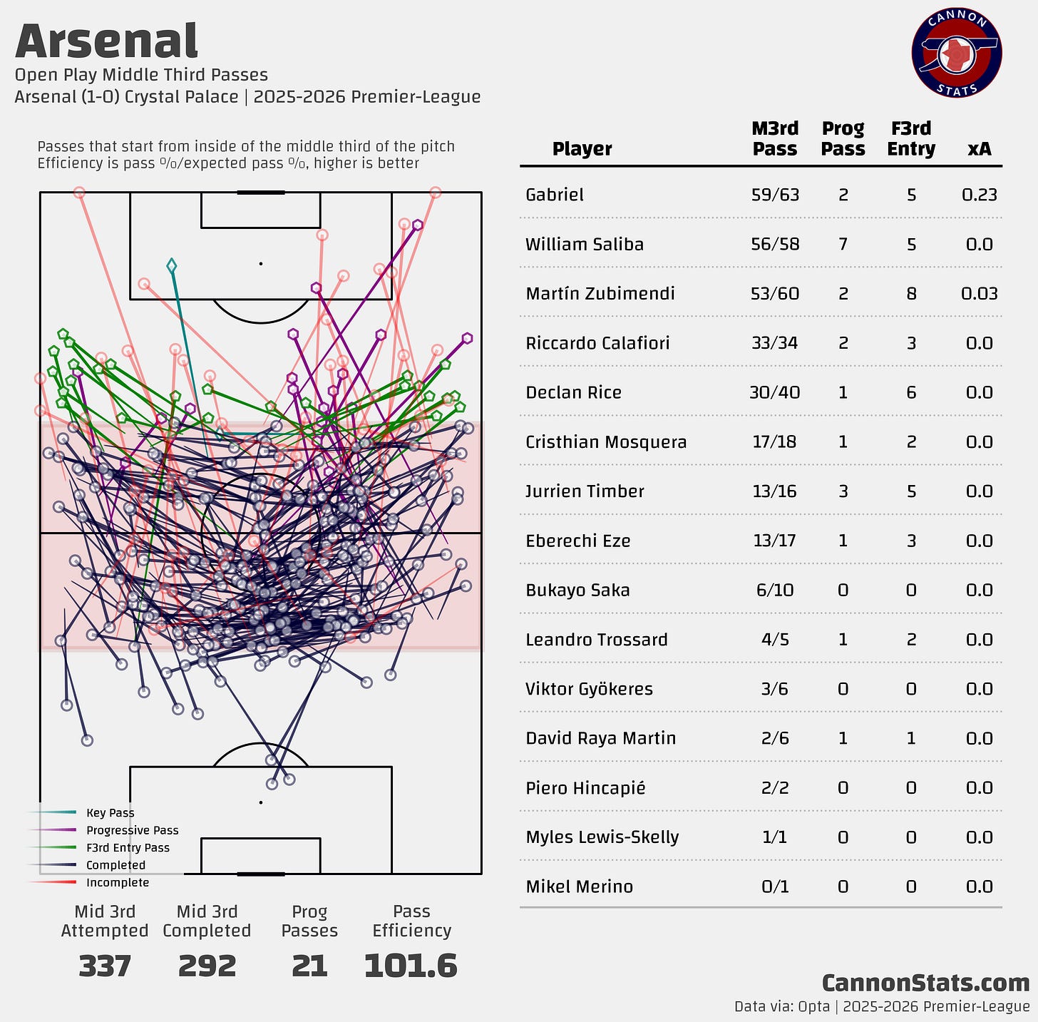 378 - Touches in the middle third for Arsenal in this match against Crystal Palace, this is the 2nd most Arsenal have had in a match this season