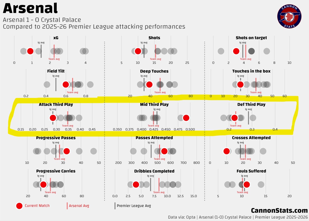 140 - Touches in the final third for Arsenal, this is the 3rd fewest that Arsenal have had in a match (only United and Liverpool have been fewer)