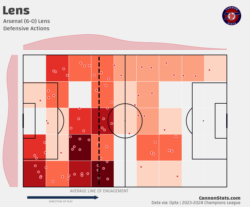 Arsenal have faced some of the deepest and most set defenses of any team in Europe. Using the measure of average defensive action faced as a proxy for defensive line height no one has faced a team closer to defending their own box than this Arsenal team.