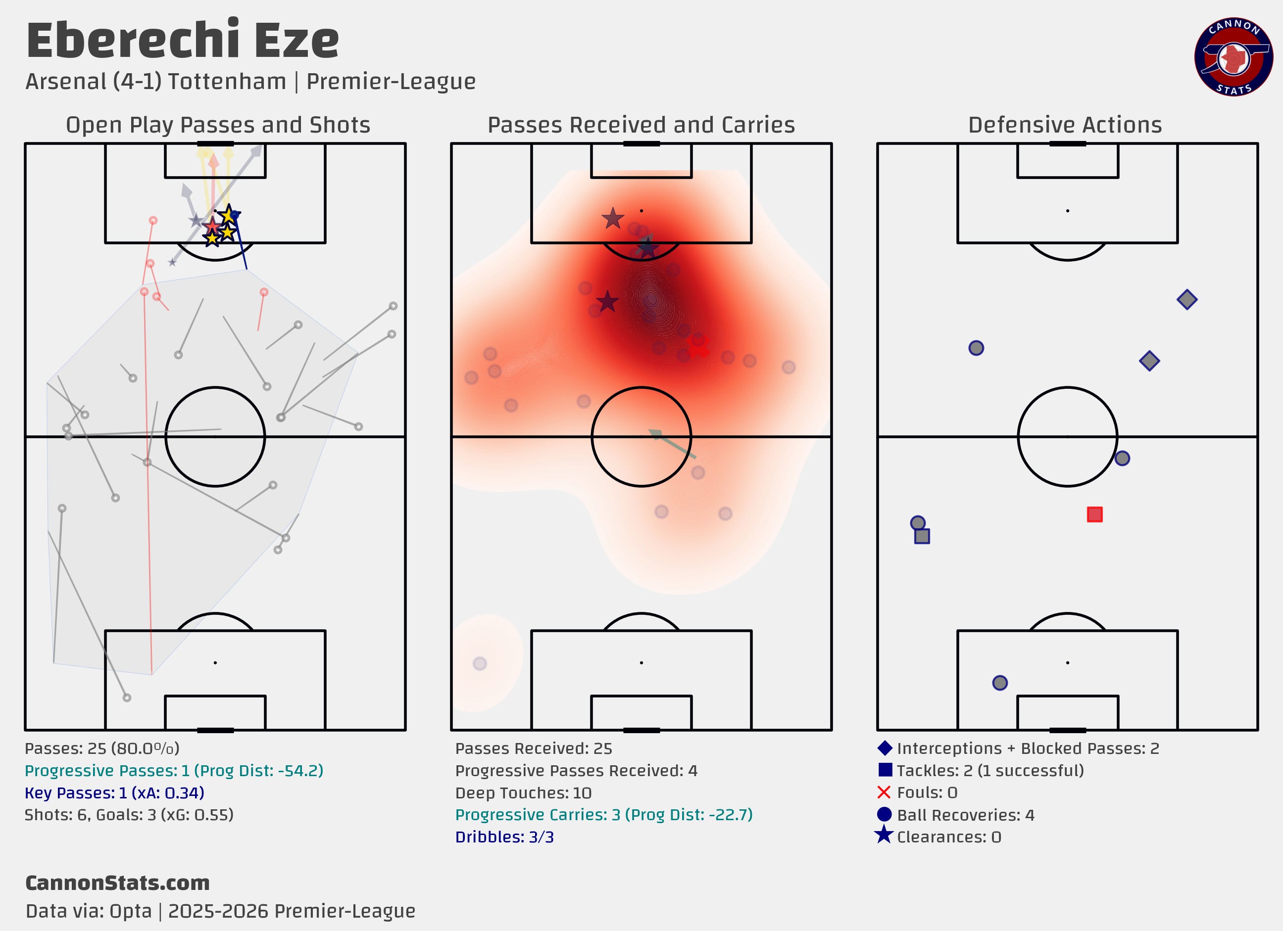 I have written quite a bit lately on the different way that Eze has gone about playing the more advanced midfielder role at Arsenal lately, this was another good example of it but in this match the difference shows the major upside that he can bring to a match. With Arsenal playing another match without a real striker, that puts the onus on the rest of the players to take on more responsibility to do striker type things and that is something that suites the strength of Eze much more than when he needs to do more ball progression from this position.
