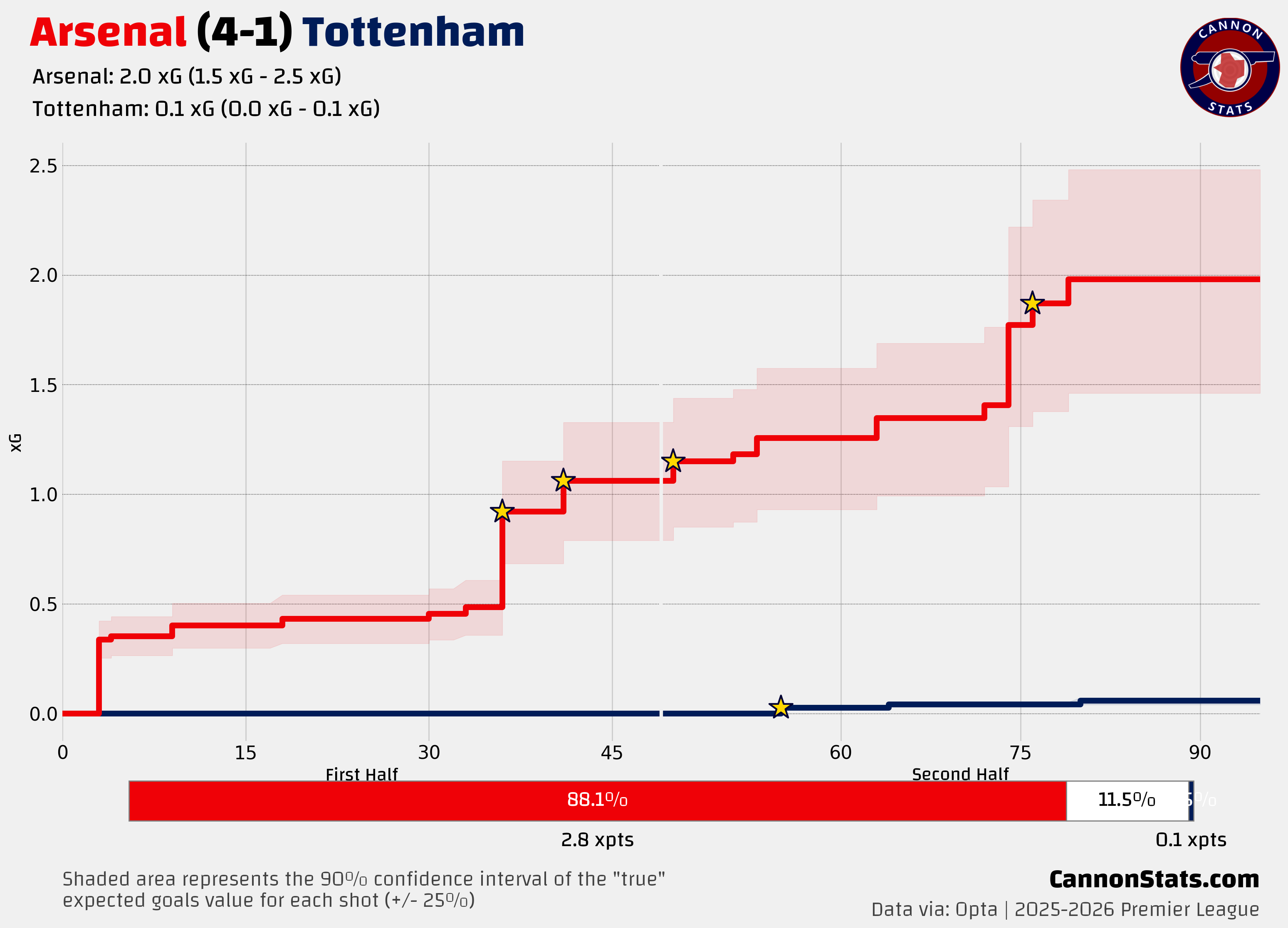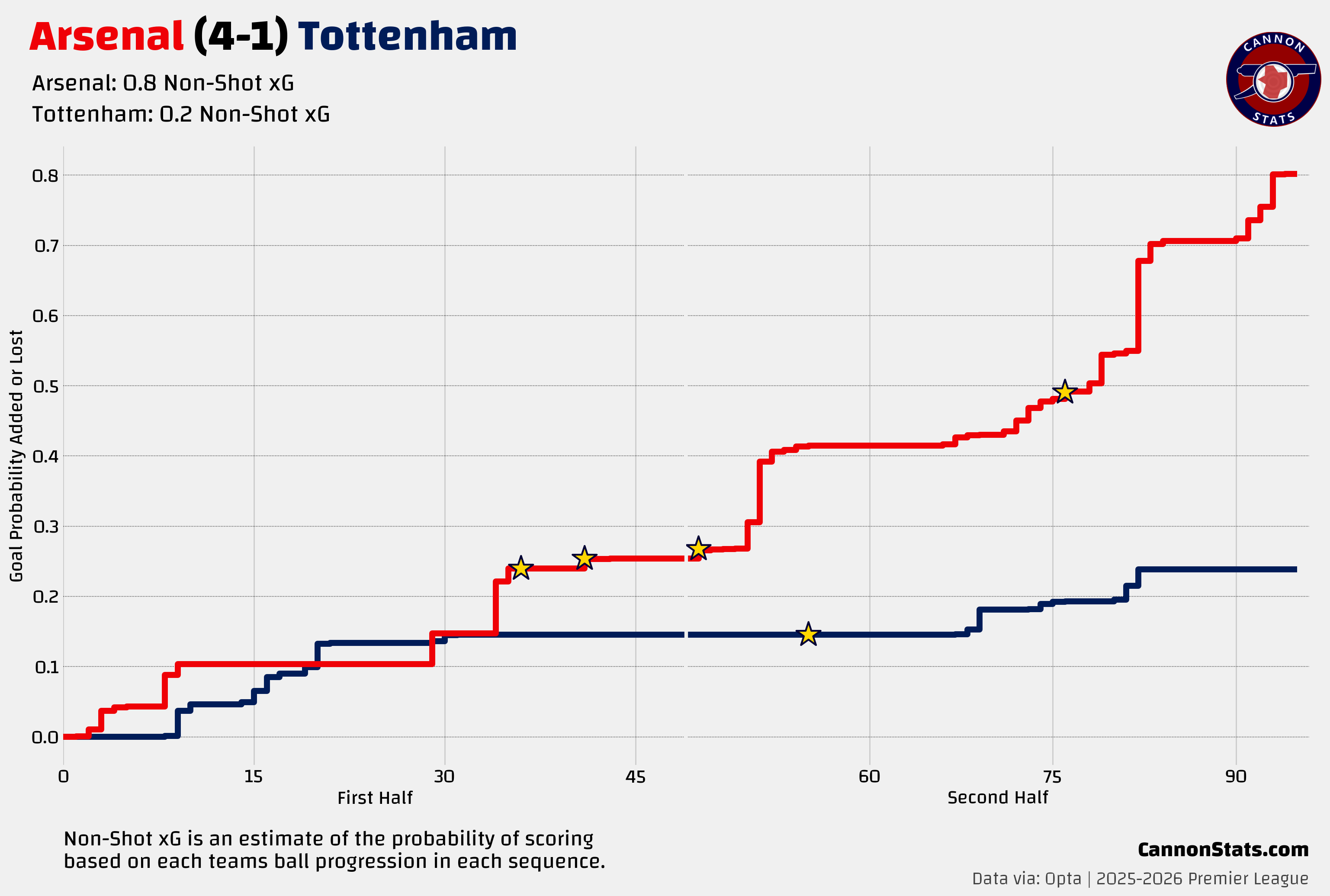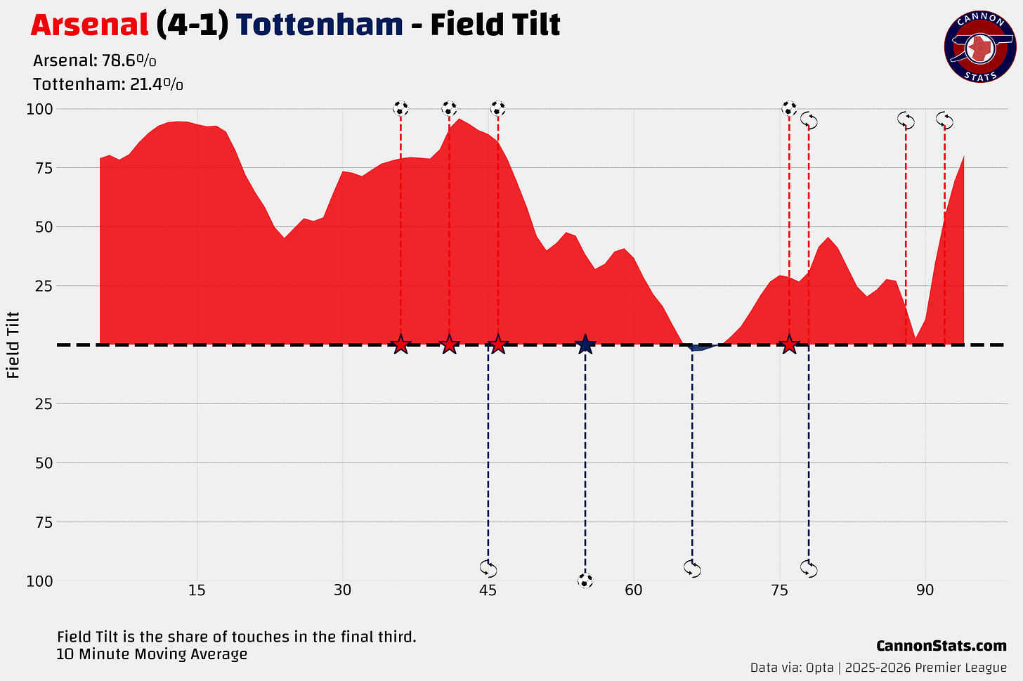 Arsenal in this match did the boa constrictor move on Tottenham, who seemed to invite that upon themselves in a silly tactical choice. Arsenal had one of their stronger days on field tilt (which is especially impressive given the score effects) and pushed basically all of the play into the Tottenham defensive third.