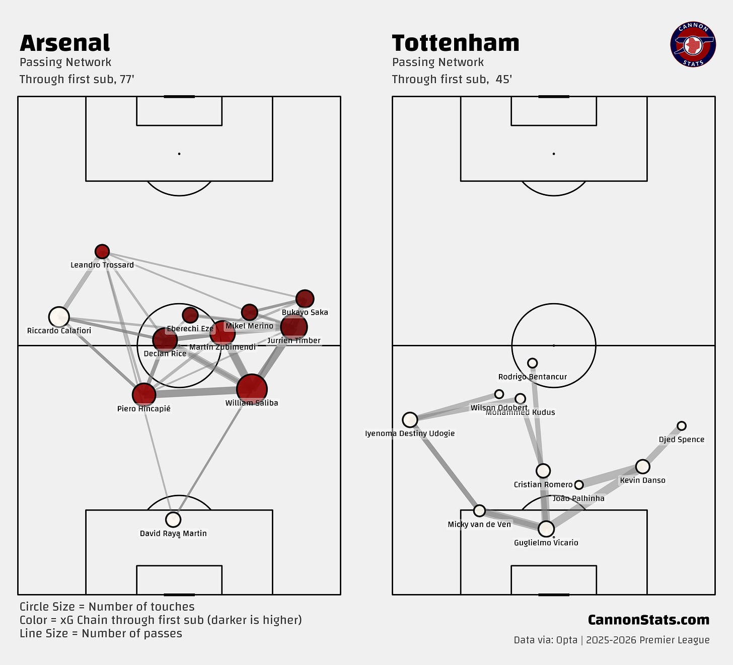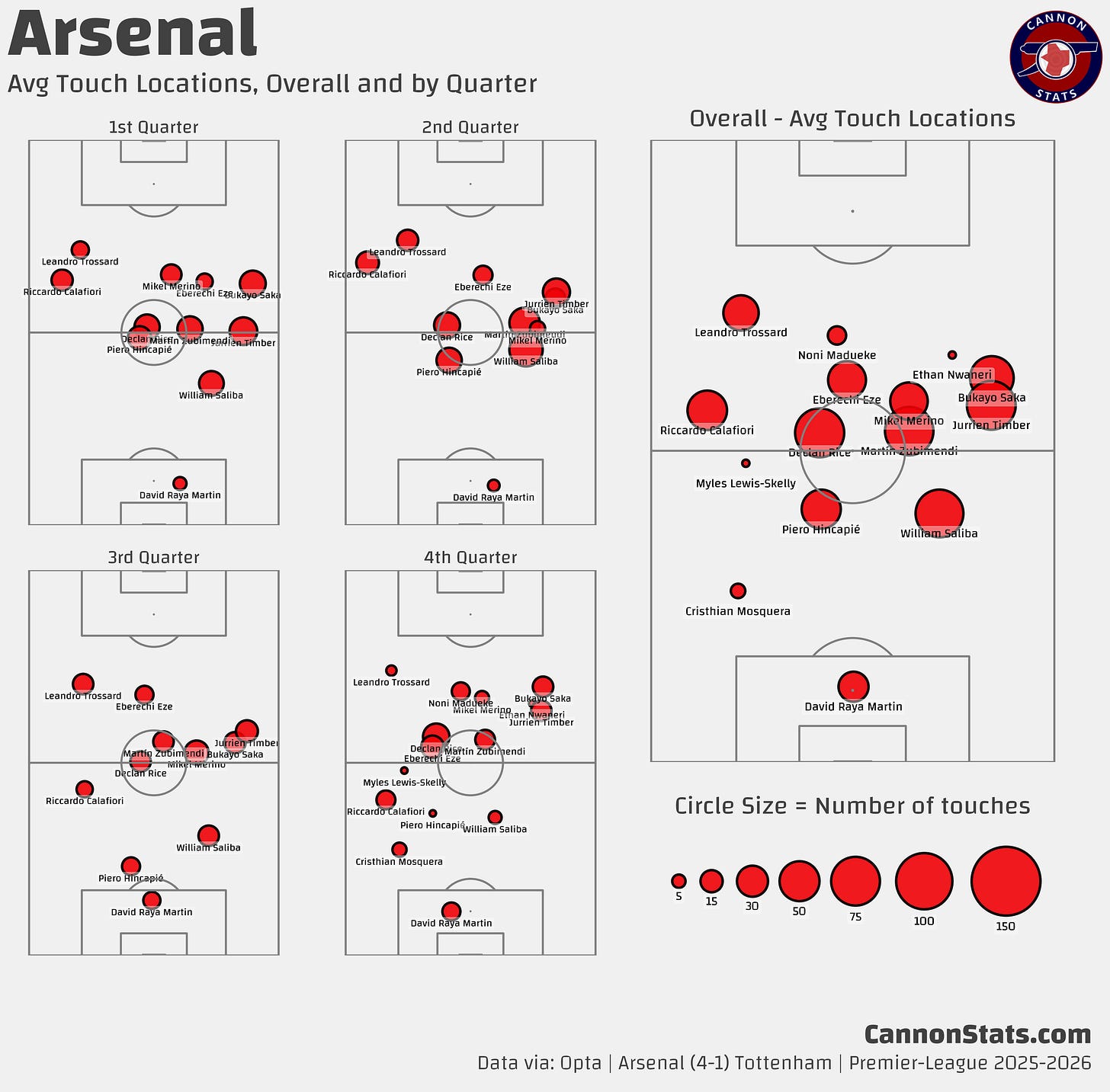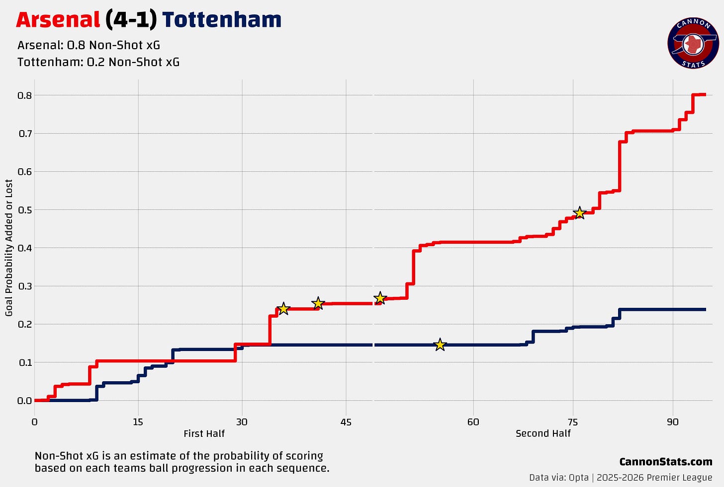 He took these positions and turned that into an impressive 6 shots. His shot volume was one of the pluses when Arsenal brought him in and it paid massive dividends today, especially with Tottenham coming in as one of the team’s weakest at blocking shots (just 25 this season, only Brighton have fewer and they are blocking just 17% of their shots faced so far).