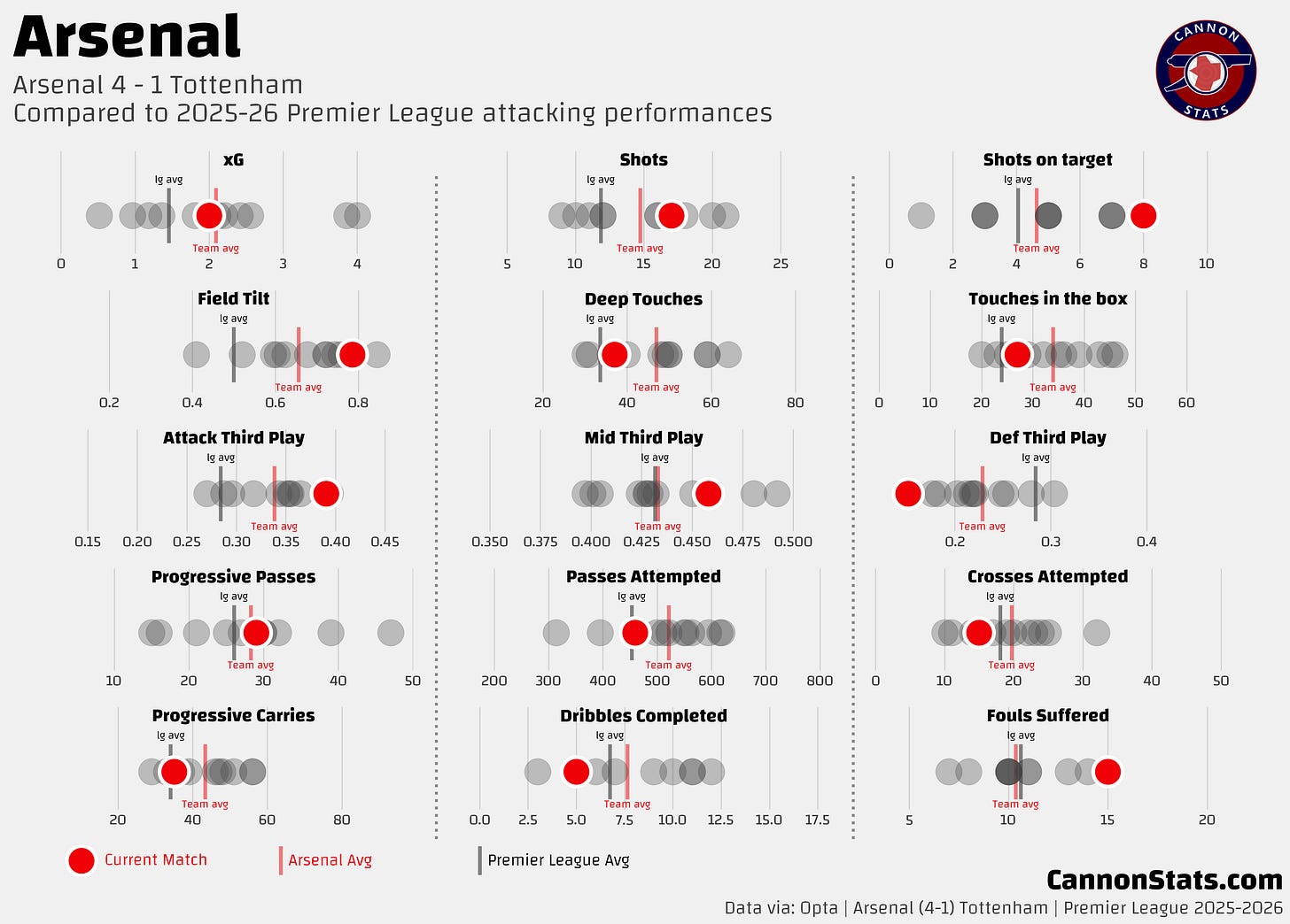 While this was a good performance and the ball went in the net which makes it so much fun, the positive here is that this isn’t some sort of outlier for what Arsenal have done this season. This is a good but not all that different than the average Arsenal attacking performance from Arsenal.