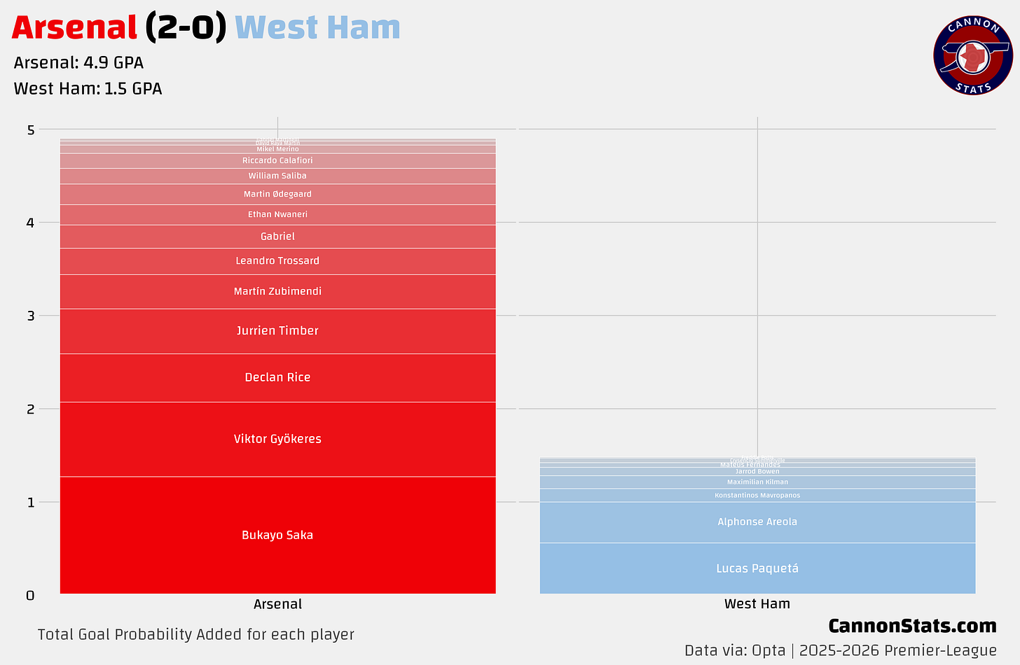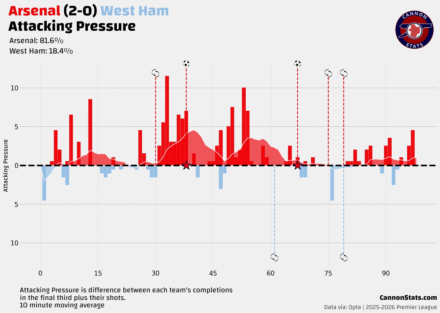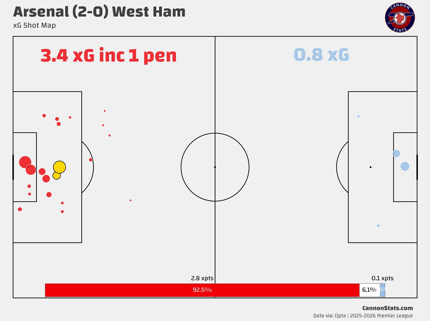 We take it for granted but again this was another suffocating match from Arsenal’s defense, between something close to the first and last kick for West Ham. They had two big chances, both from corners, one in the 1st minute and the other in the 92nd minute and between that they had just two shots with neither being valued at more than 4%.