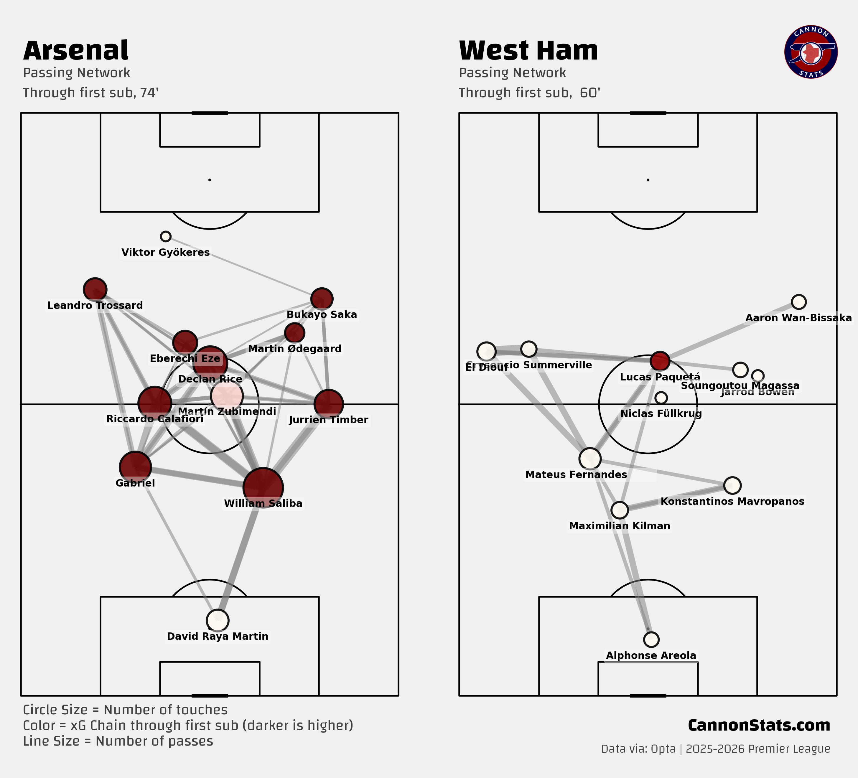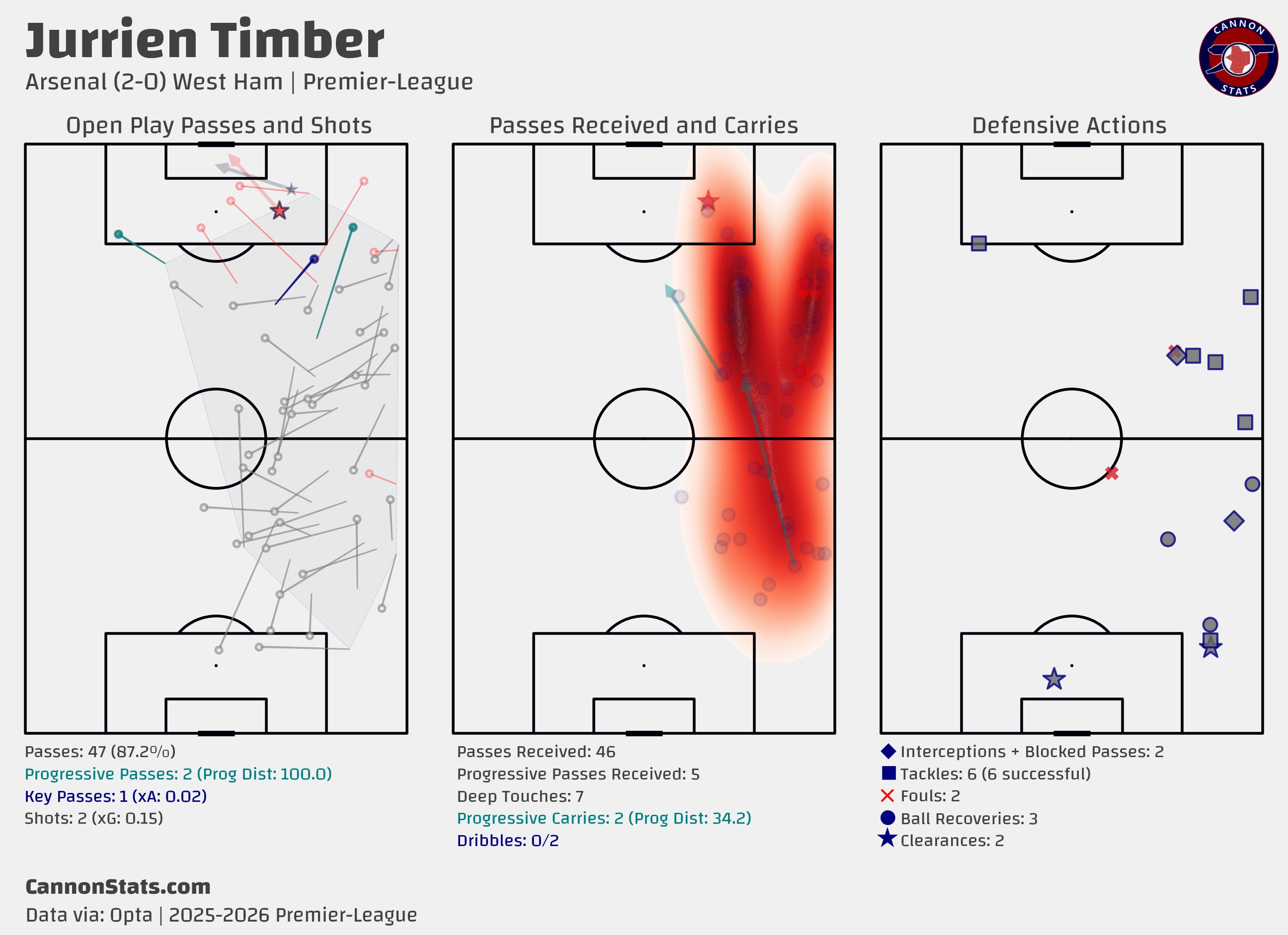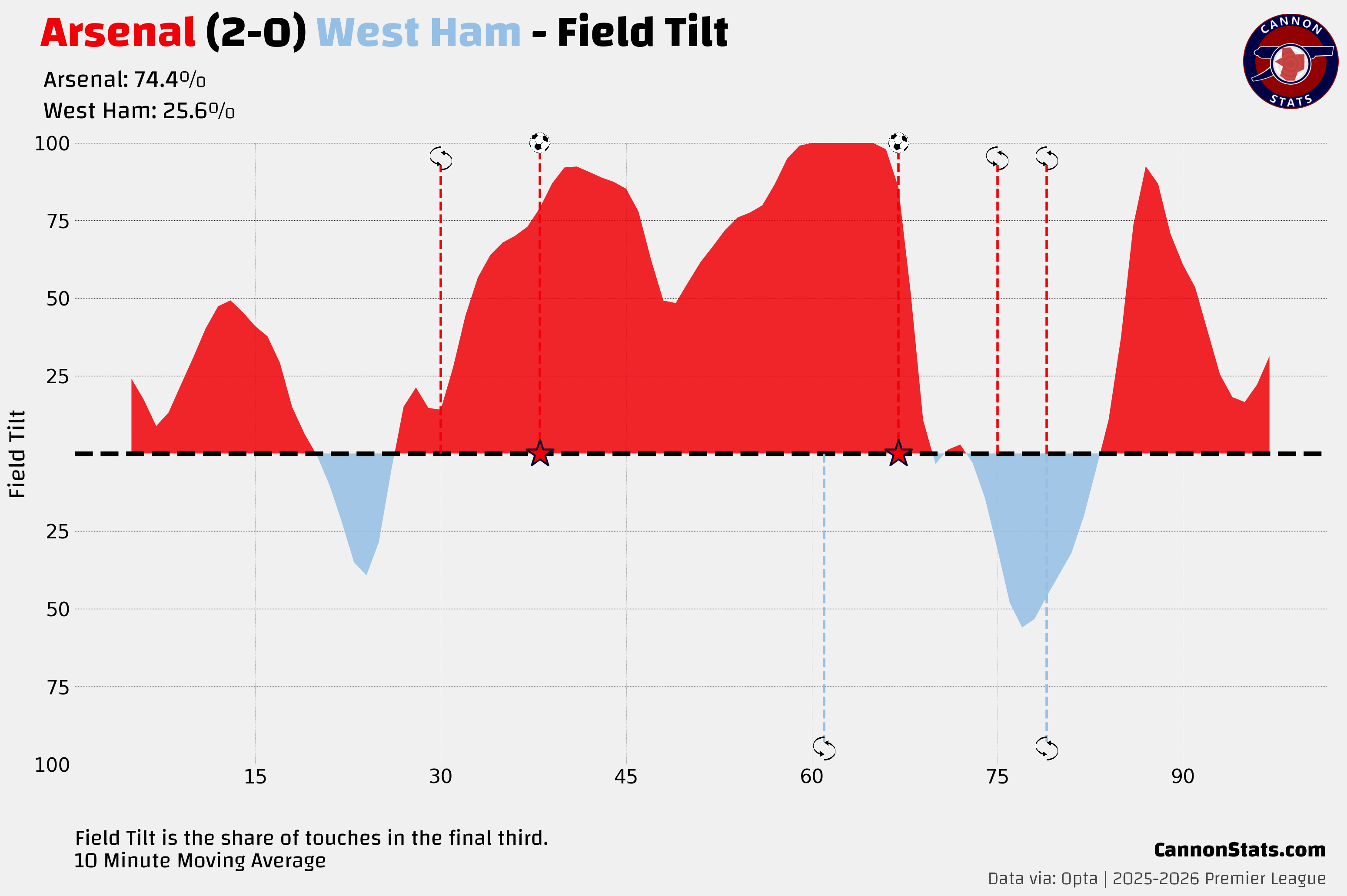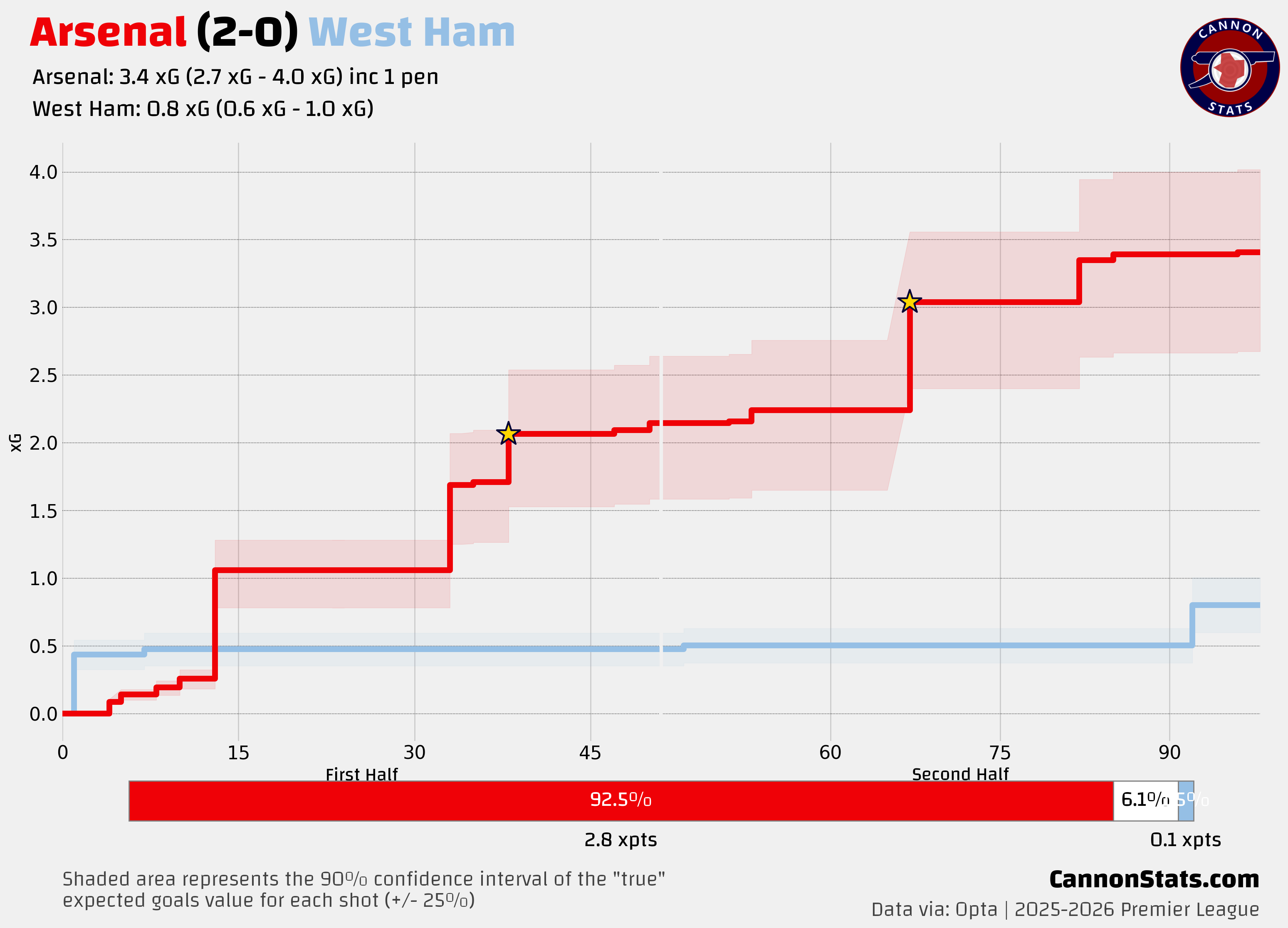 We take it for granted but again this was another suffocating match from Arsenal’s defense, between something close to the first and last kick for West Ham. They had two big chances, both from corners, one in the 1st minute and the other in the 92nd minute and between that they had just two shots with neither being valued at more than 4%.