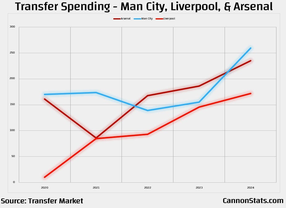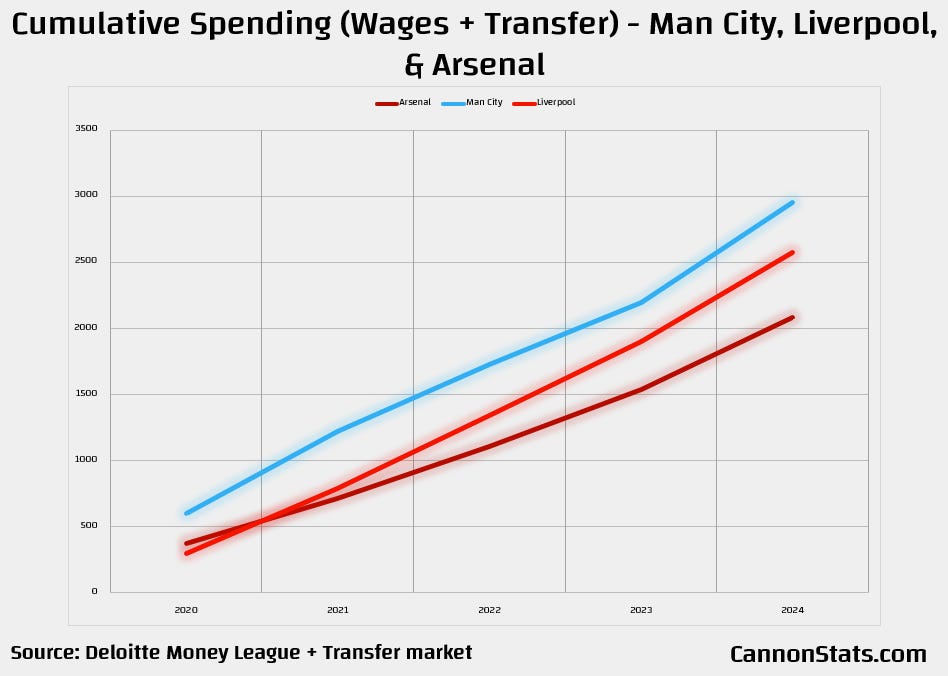 Looking at the cumulative spending on wages and net spending in the transfer market for the three main Premier League clubs really shows this. Liverpool and Arsenal have spent a lot of money, but it still is well below what Manchester City have been able to do to maintain their spot at the top of the Premier League.