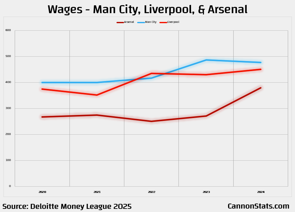 This makes sense, Arsenal focused their recruitment on younger players that have developed over time. These are players that often come with a premium to acquire but have lower wages at the beginning of their contracts. As they prove their level the wages reflect their performance and will go up as they stay with the team longer. Arsenal were at the beginning of that cycle while Manchester City and Liverpool were already established at a very high level.