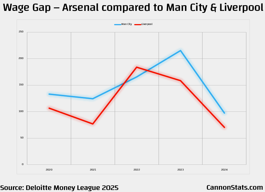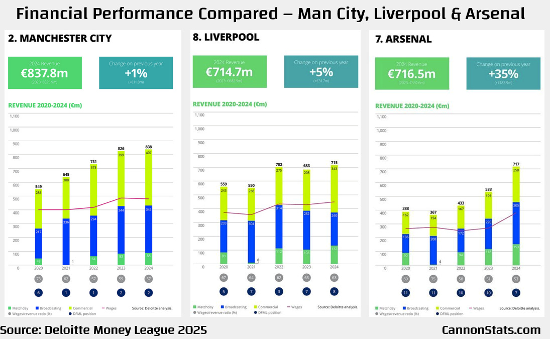 Overall, for the period that this covers in the Money League Manchester City have spent €2.1 billion in wages, Liverpool have spent €2.0 billion in wages, and Arsenal have spent €1.4 billion in wages.
