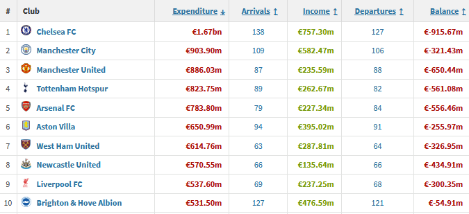 Overall, Arsenal have spent the fifth most in absolute terms and fourth most in net terms.