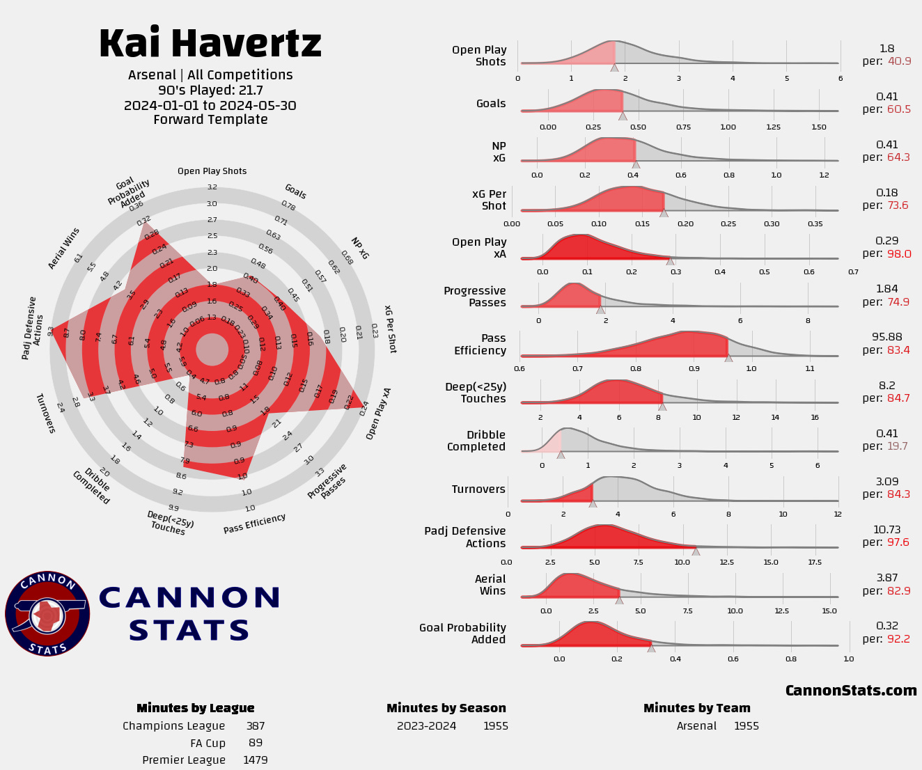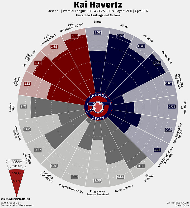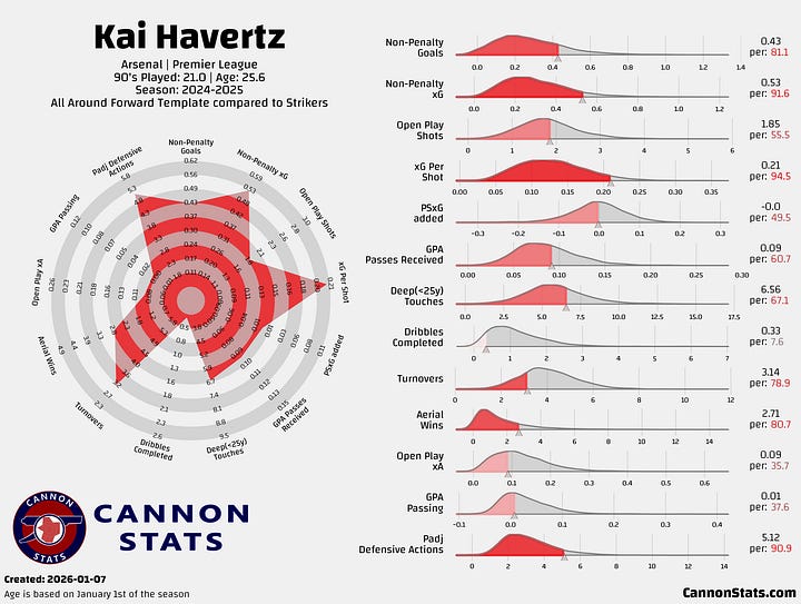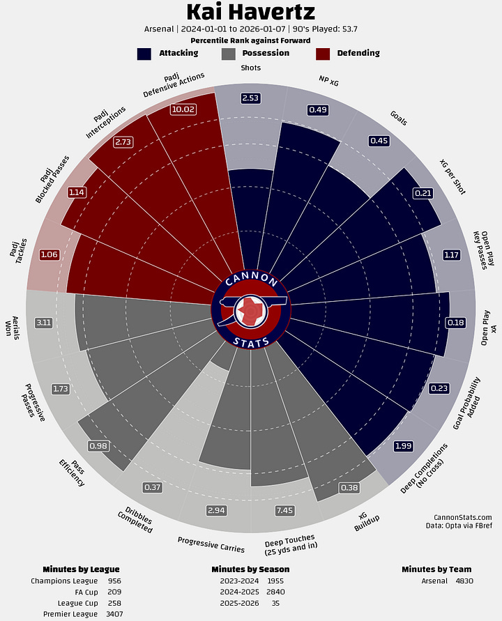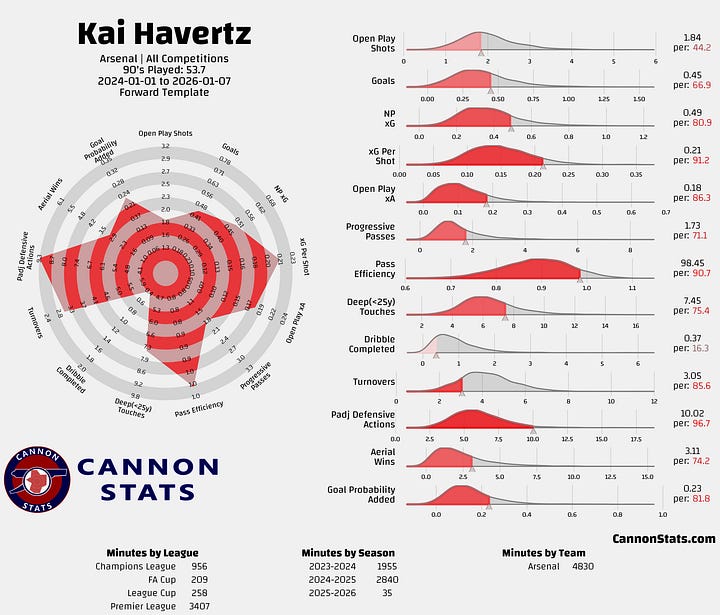 Havertz with at Arsenal finds himself in a tough spot. He’s not someone you’d call a top-tier or elite forward, but the list of players who provide more total value to their team is pretty short. This is basically the dreaded Oliver Giroud zone, and I think that you can make a point that is where Havertz falls.