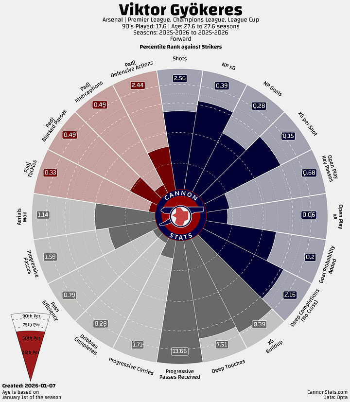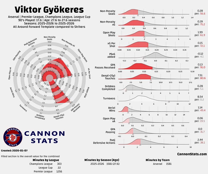 What he has not done is match all of the other stuff that Havertz was able to do as a striker. Most people were not the biggest fan of Havertz in midfield, but he was capable of doing that with his technical level and I don’t think that you could say anything remotely close with Gyokeres and that shows up in the creative and overall passing numbers.