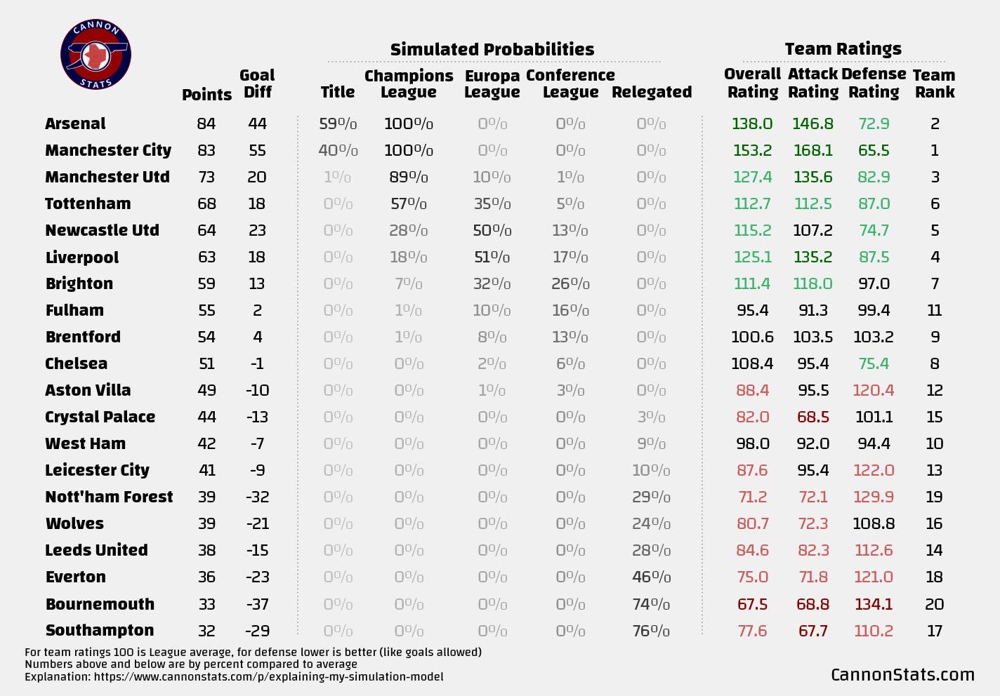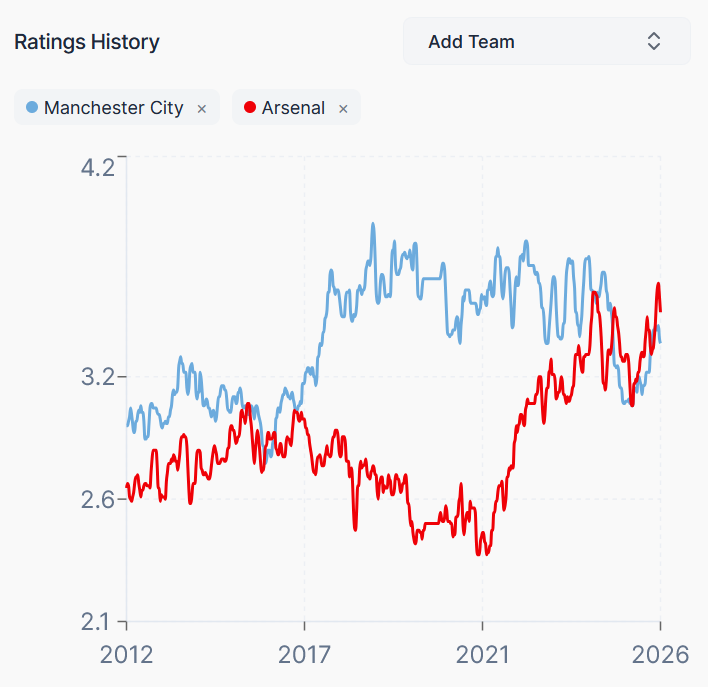At this stage of the season, they had the highest rating of any team at 3.53 compared to Arsenal’s 3.02. The current rating is again flipped, and Arsenal have overtaken them as the highest rated team at 3.48 while City are still strong but are at 3.34.