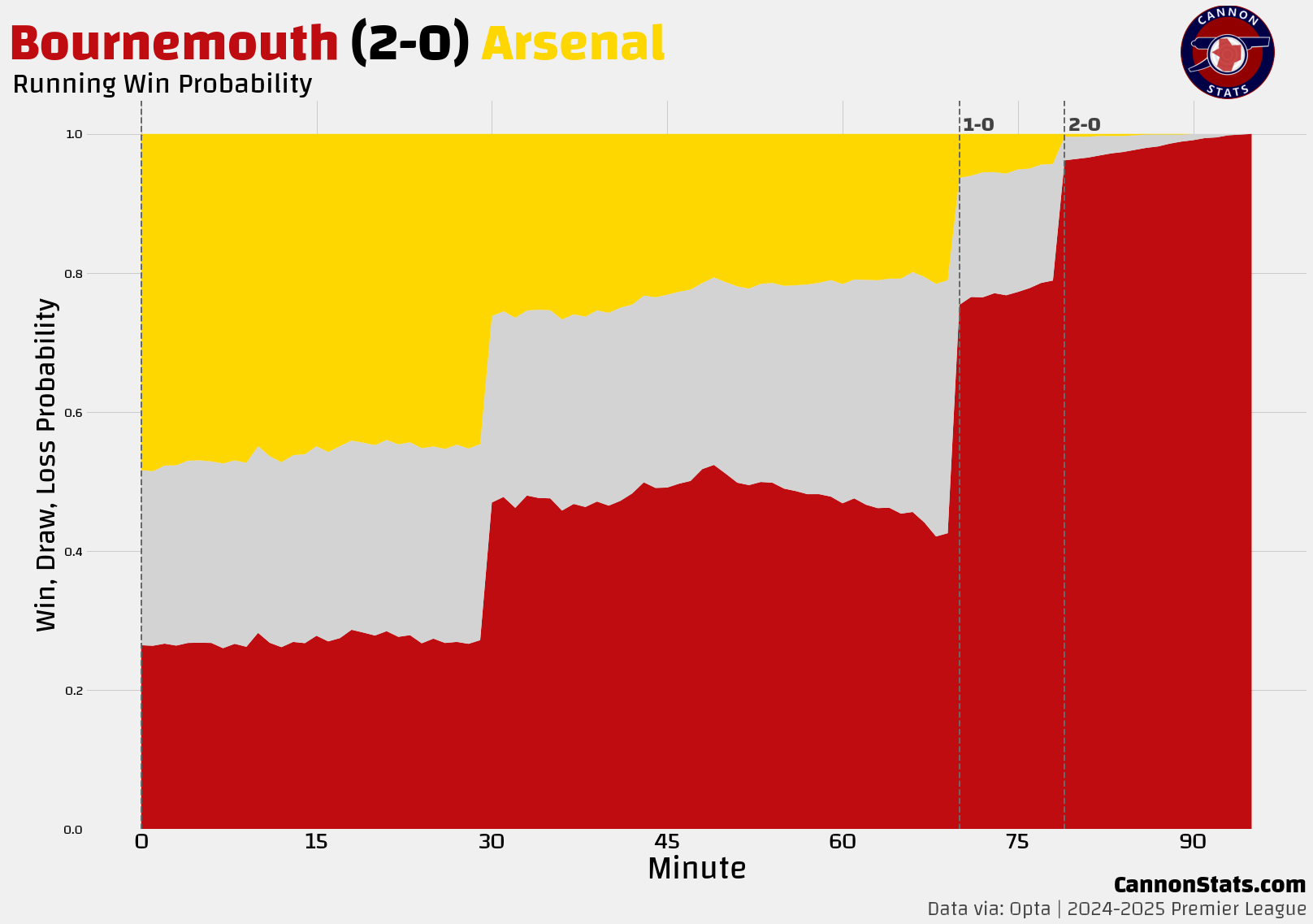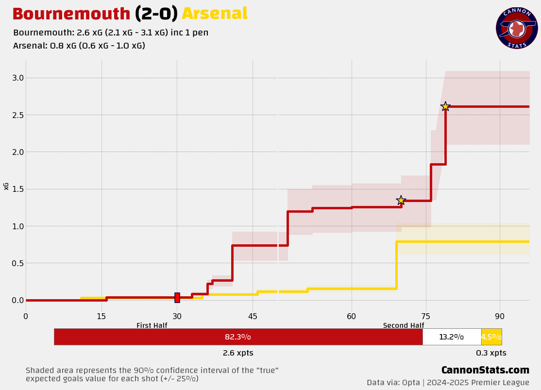 This is a big swing of 1.1 goals and shifts the win probability from 55% for Arsenal to 28% and from 19% to 46% for Bournemouth.