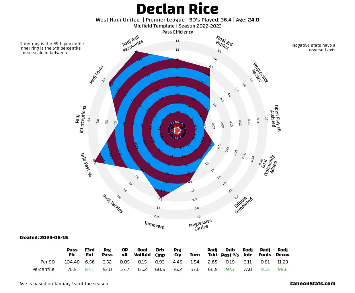 This will be looking at Rice’s stats by area/category from last season, this was a bit of a “down” year from what he did in 2021/22 but it was also that for in a bigger way in the Premier League for all of West Ham. All data will be per 90 minutes unless said otherwise and compared to midfielders from the top five European Leagues going back to 2015/16 for percentile comparisons.