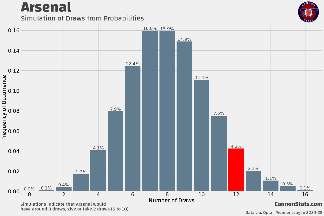 When you run a simulation of the post-match win/draw/loss odds to get a spread of how many draws you would expect Arsenal to have had this season, you get the following: