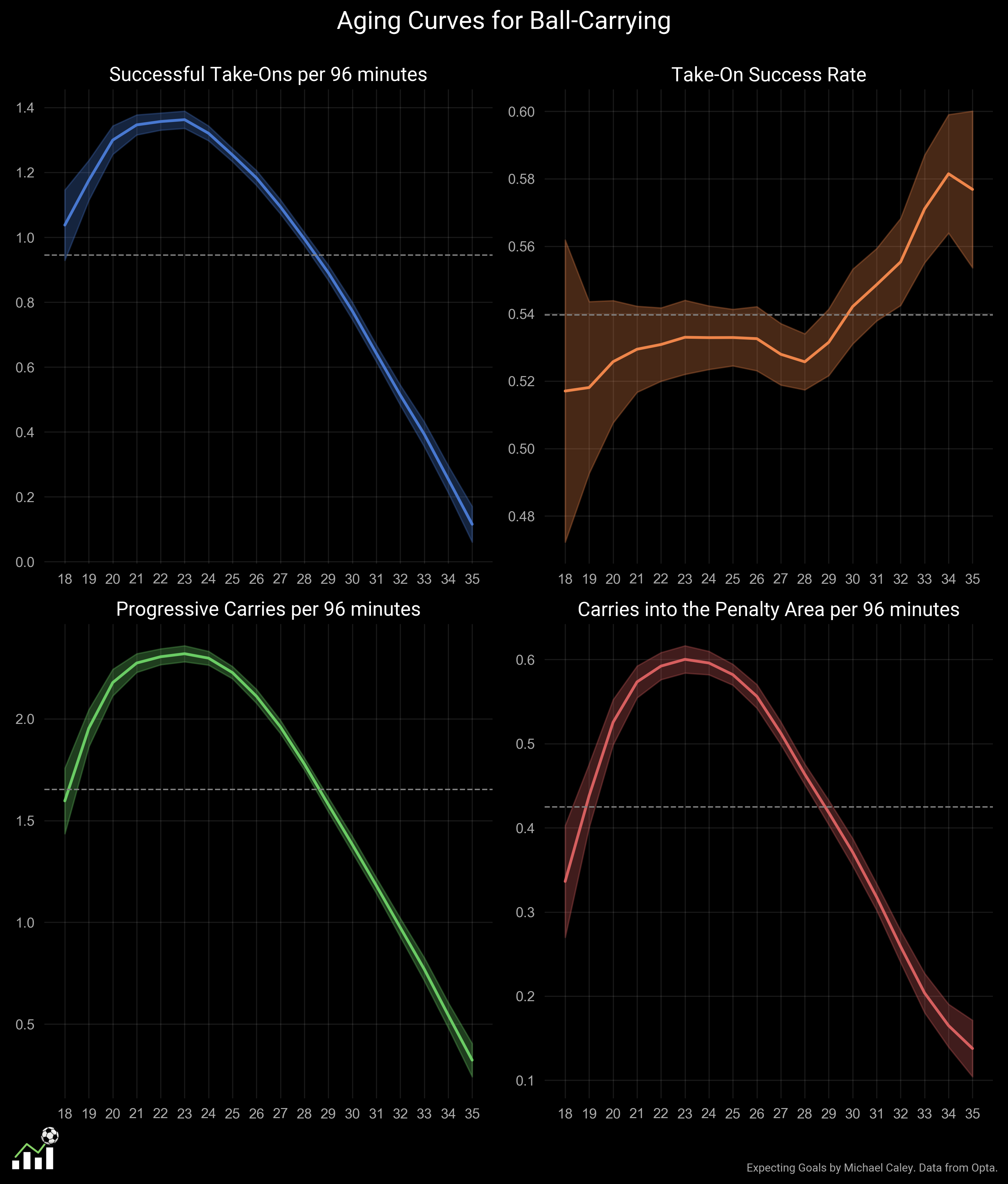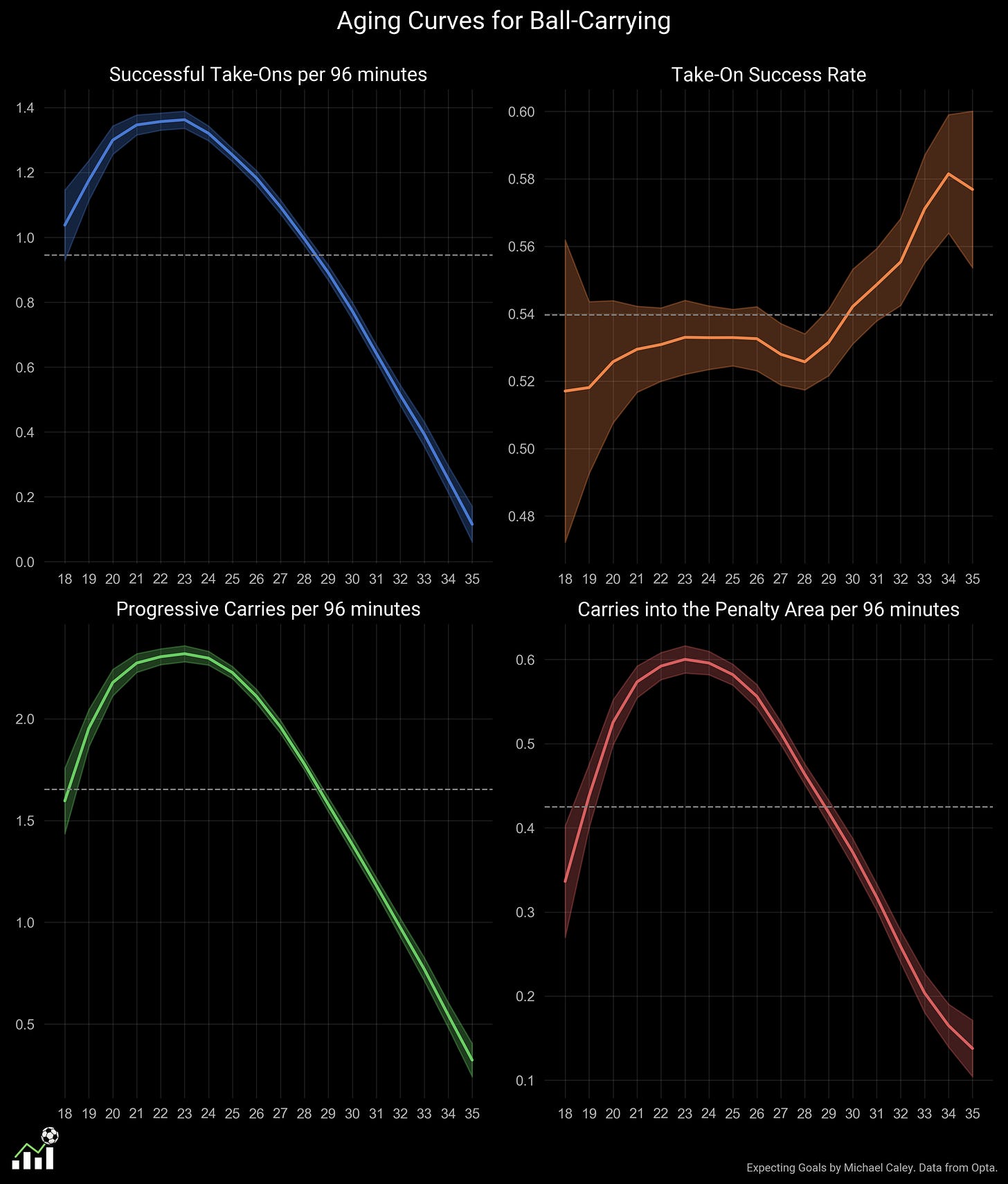 Carrying and dribbling are also a young player skill and with Eze completing his age 26 season that is typically post peak for these stats. Here is a look at how these skills change with age from Michael Caley from his expecting goals newsletter:
